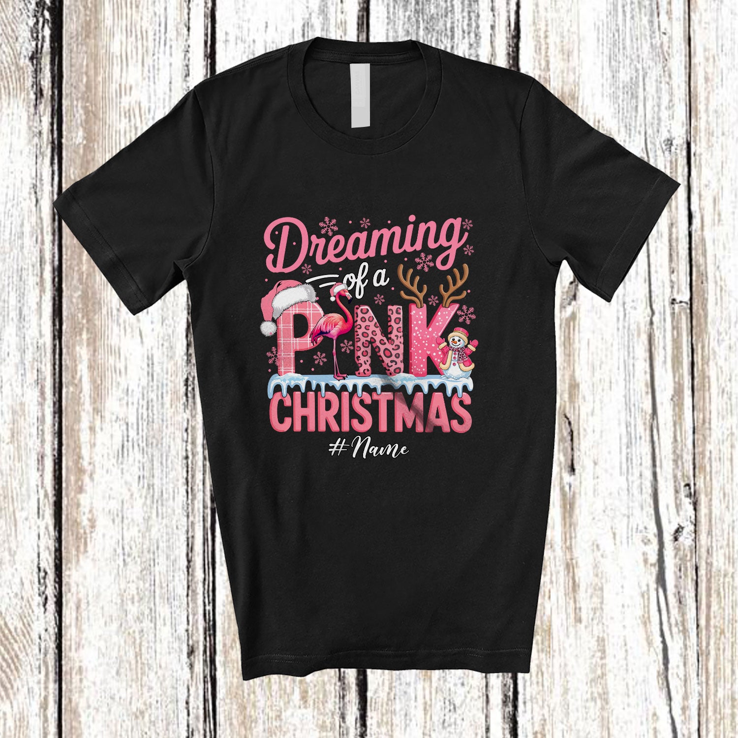 Personalized Custom Name Dreaming Of A Pink Christmas; Adorable Pink Plaid Leopard Flamingo T-Shirt
