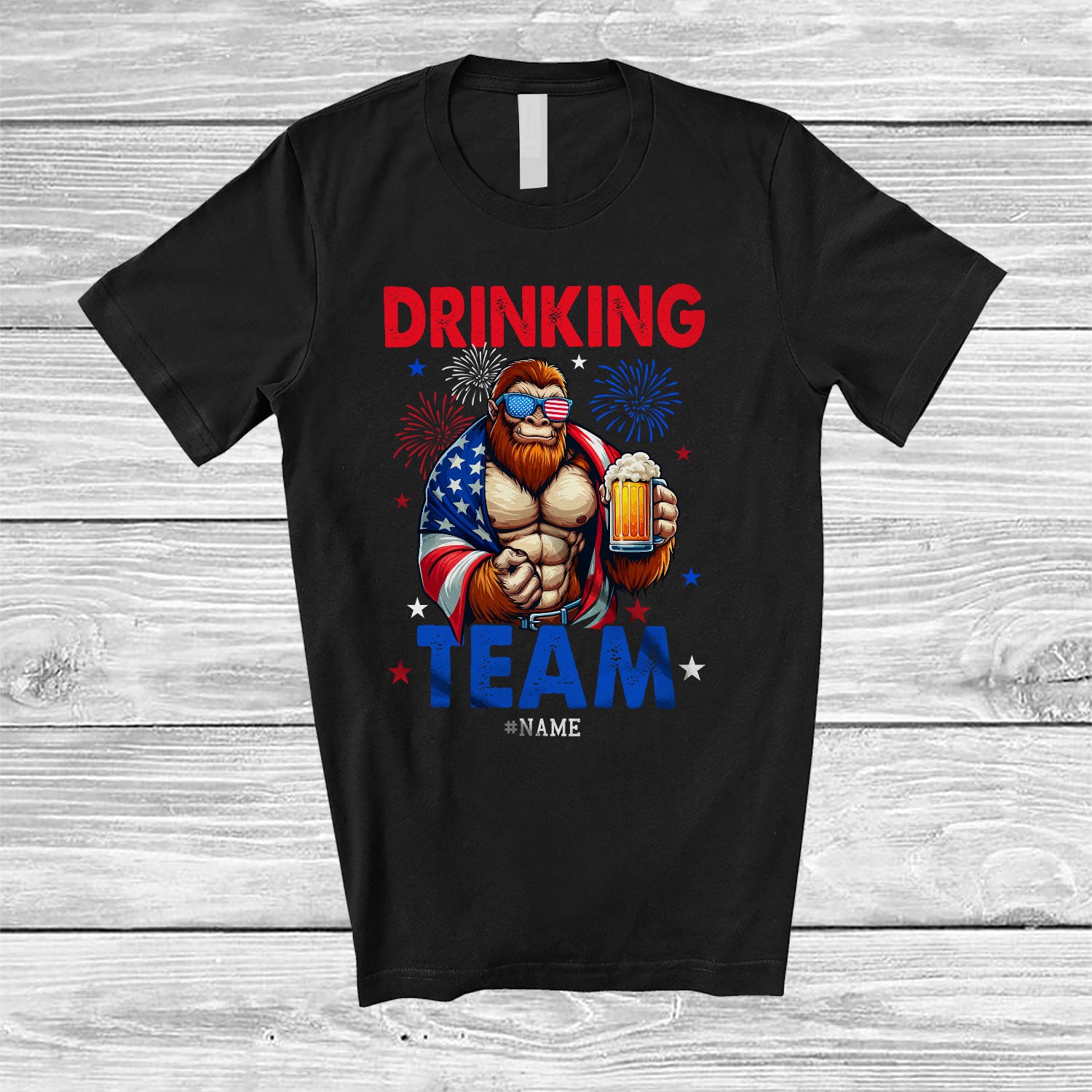• Personalized Custom Name Drinking Team; Humorous 4th Of July Bigfoot Drunker Beer; Patriotic T-Shirt. This cotton t-shirt is a durable staple product with a classic fit. One of the most popular items, it has a relaxed style made for everyday and casual wear.