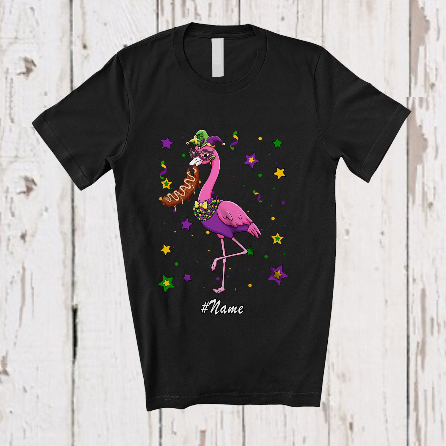 Personalized Custom Name Flamingo Masked Eating Sausage; Joyful Mardi Gras Beads Food T-Shirt. This cotton t-shirt is a durable staple product with a classic fit. One of the most popular items, it has a relaxed style made for everyday and casual wear.