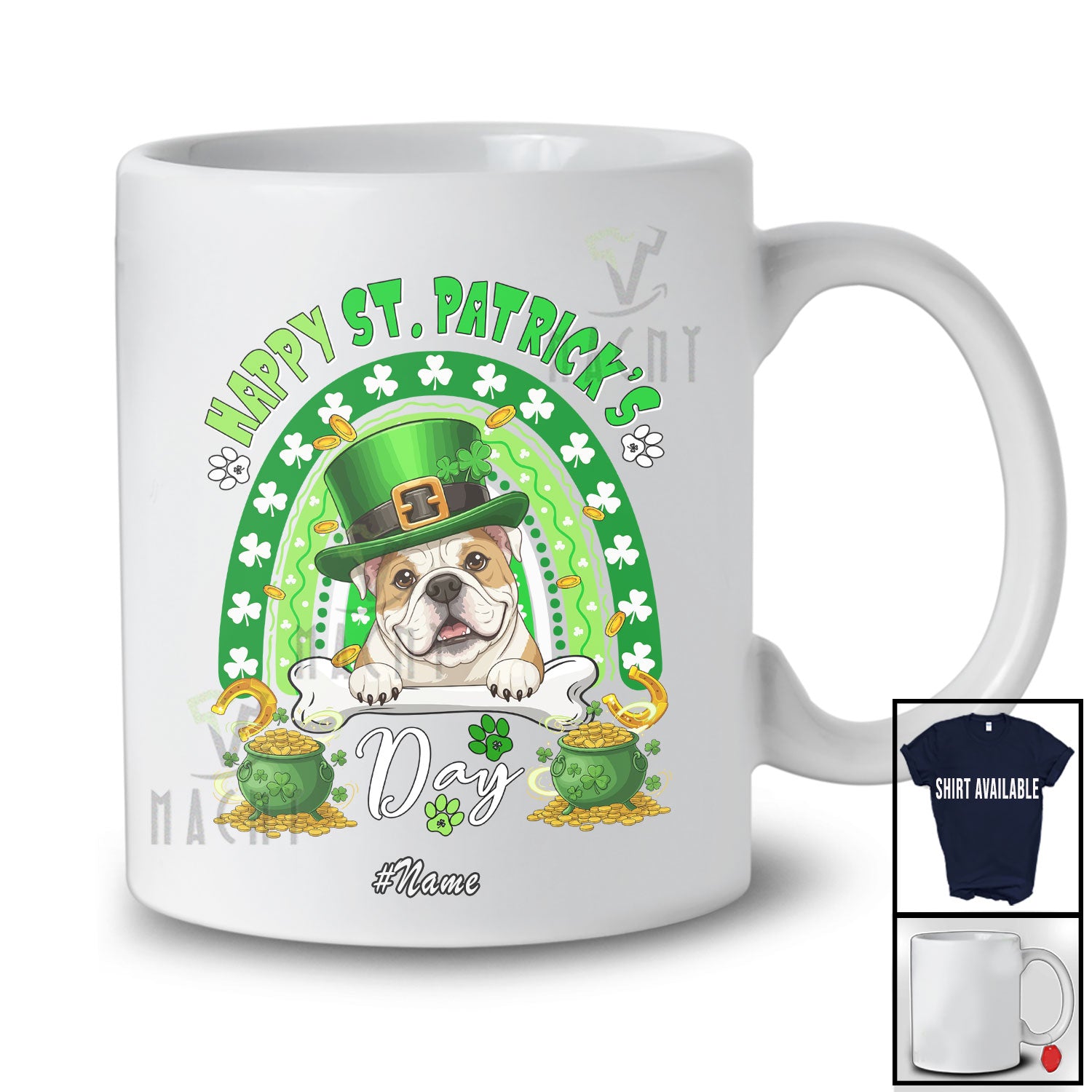 • Personalized Custom Name Happy St. Patrick's Day; Humorous Leprechaun Bulldog Rainbow T-Shirt. This cotton t-shirt is a durable staple product with a classic fit. One of the most popular items, it has a relaxed style made for everyday and casual wear.