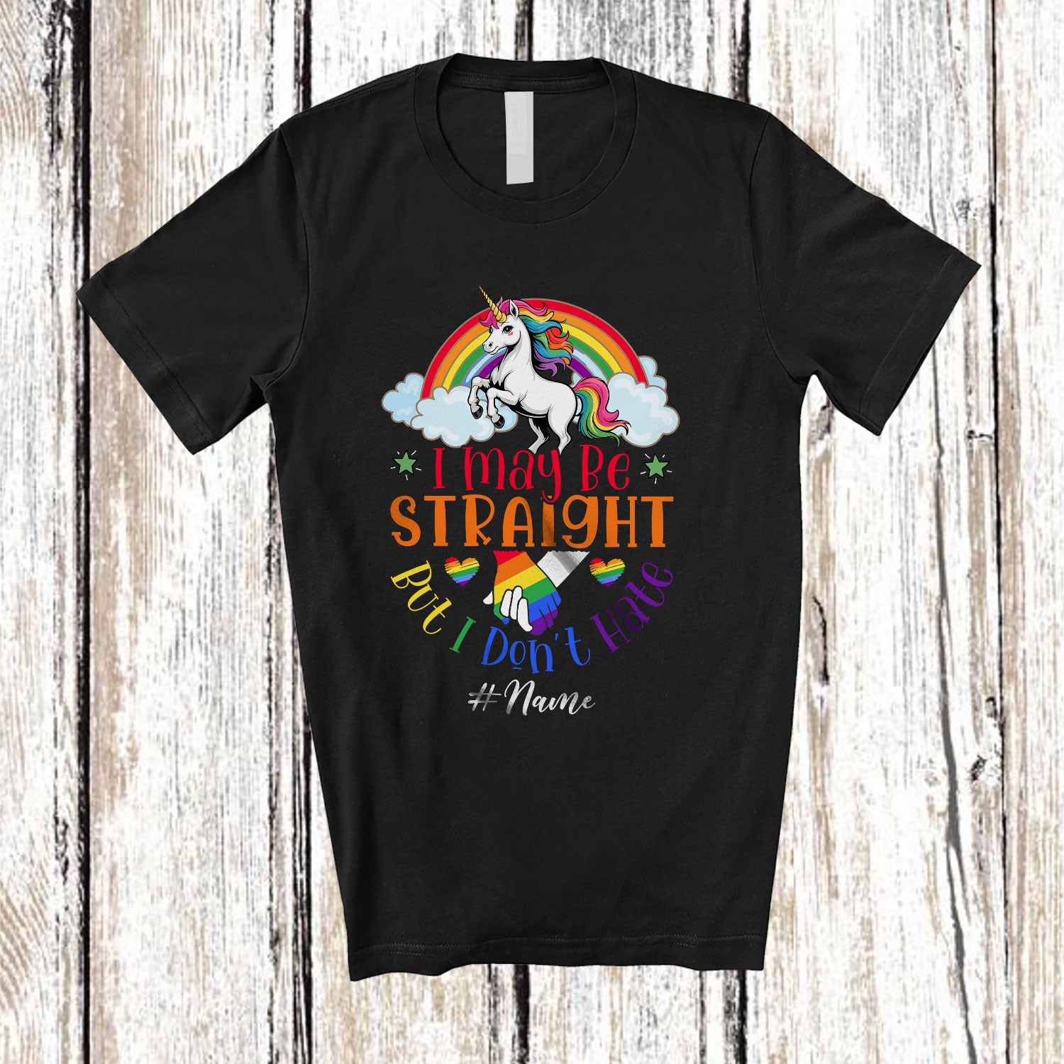 Personalized Custom Name I May Be Straight But I Don't Hate; Joyful LGBTQ Rainbow Gay Unicorn T-Shirt