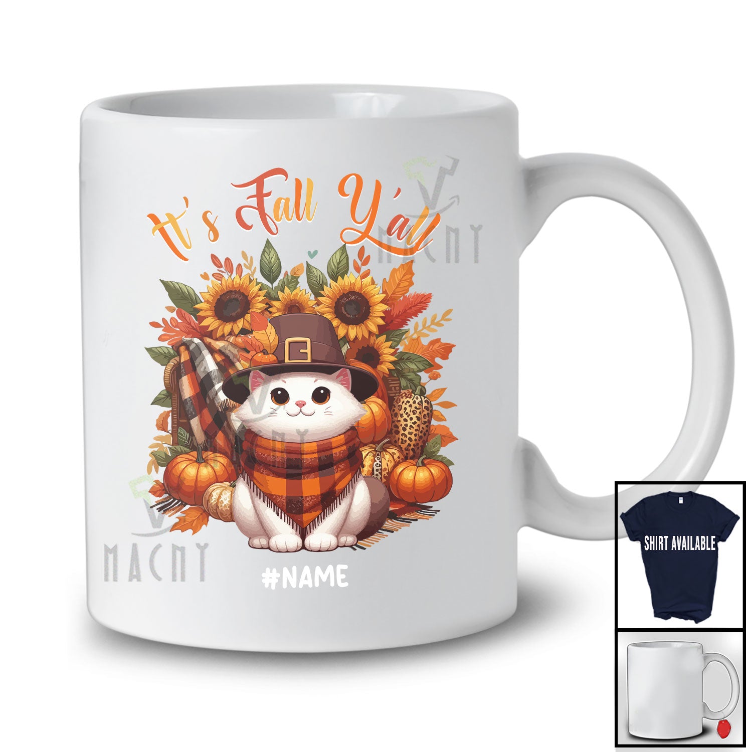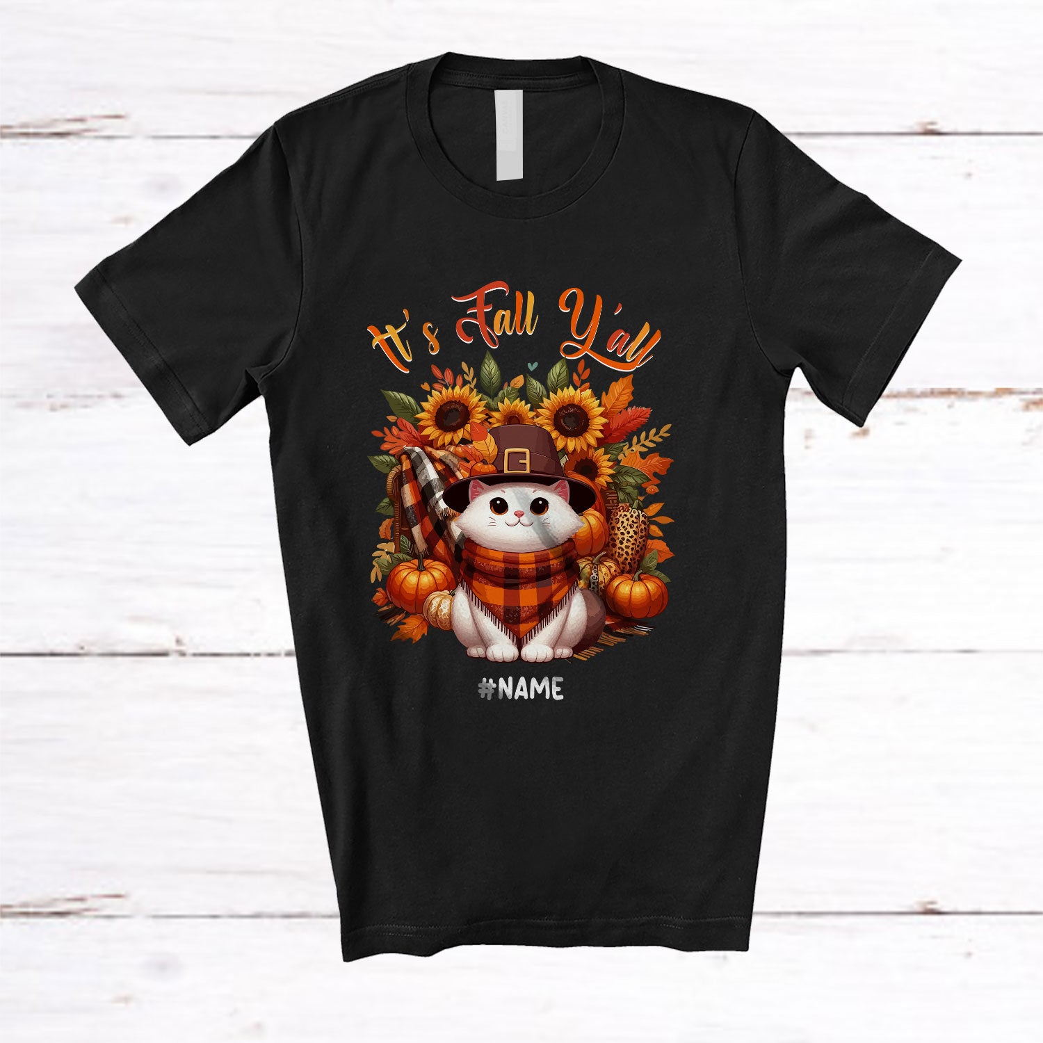 Personalized Custom Name It's Fall Y'all; Wonderful Thanksgiving Pilgrim Cat Pumpkin Sunflower T-Shirt