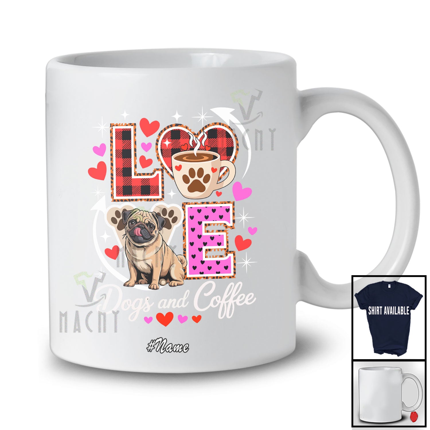 new MacnyStore - Personalized Custom Name LOVE Dog And Coffee; Lovely Valentine's Day Plaid Heart Pug T-Shirt – Macnystore