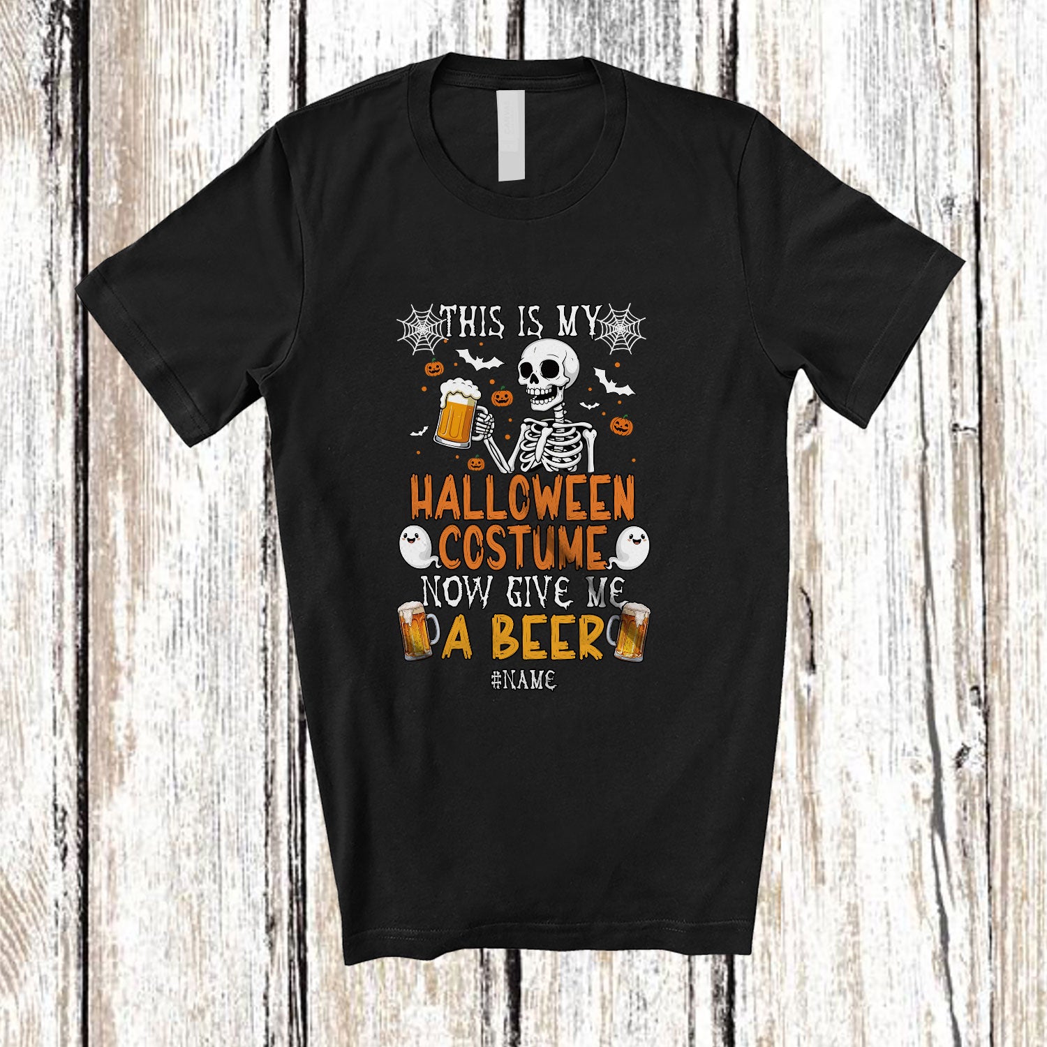 Personalized Custom Name My Halloween Costume Now Give Me A Beer; Scary Skeleton Drinking T-Shirt. This cotton t-shirt is a durable staple product with a classic fit. One of the most popular items, it has a relaxed style made for everyday and casual wear.