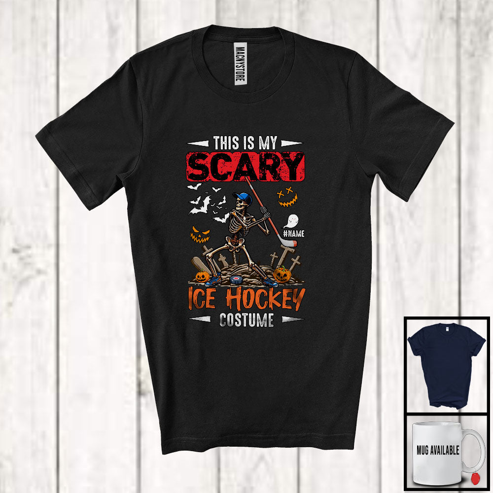 • Personalized Custom Name My Scary Ice Hockey Costume; Creepy Halloween Skeleton Playing Sport T-Shirt. This cotton t-shirt is a durable staple product with a classic fit. One of the most popular items, it has a relaxed style made for everyday and casual wear.