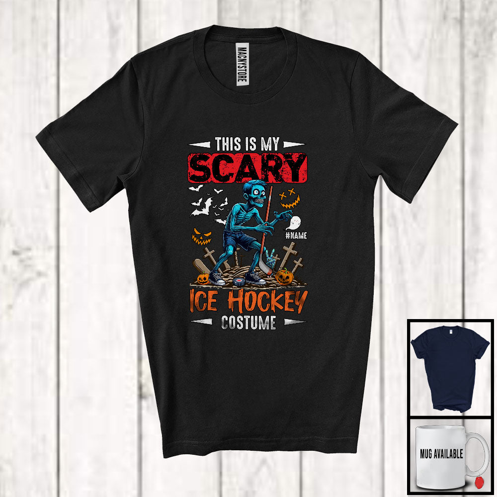 Personalized Custom Name My Scary Ice Hockey Costume; Creepy Halloween Zombie Playing Sport T-Shirt. This cotton t-shirt is a durable staple product with a classic fit. One of the most popular items, it has a relaxed style made for everyday and casual wear.
