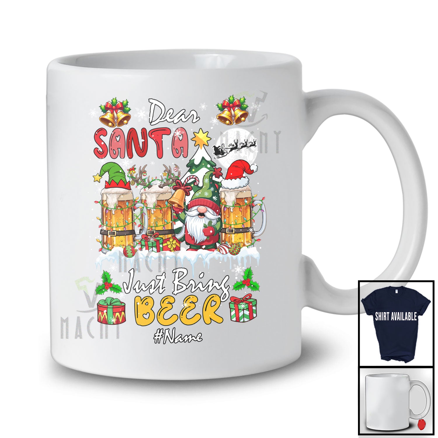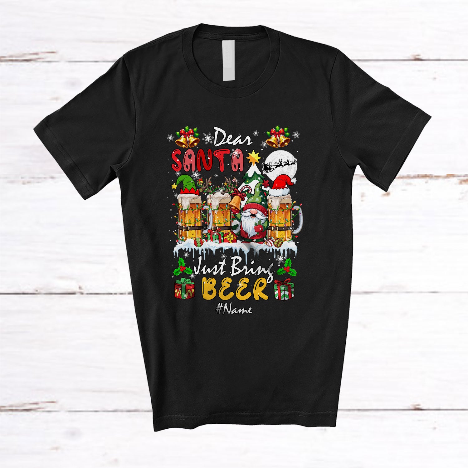 Personalized Custom Name Santa Just Bring Beer; Joyful Christmas Drinking Three Beer Glasses T-Shirt. This cotton t-shirt is a durable staple product with a classic fit. One of the most popular items, it has a relaxed style made for everyday and casual wear.