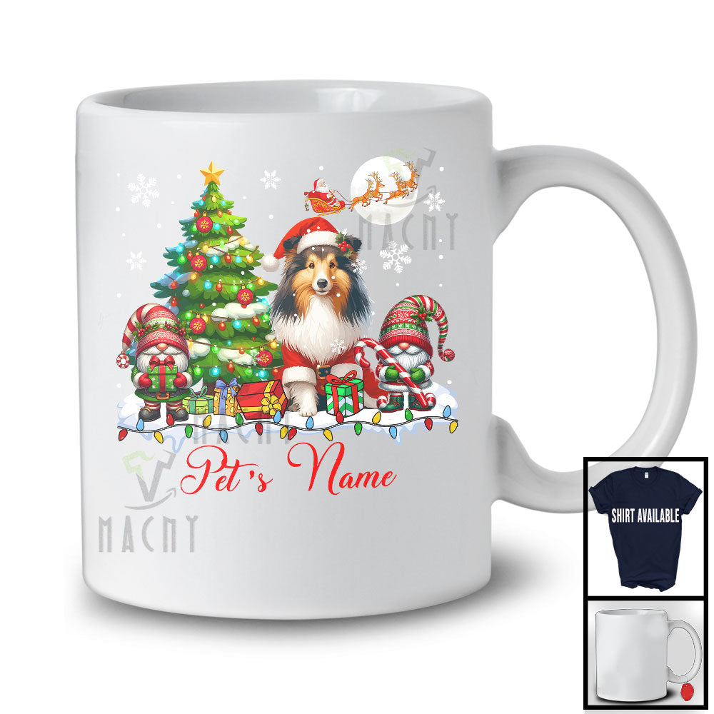Personalized Custom Name Santa Shetland Sheepdog With Gnome, Lovely X-mas Tree, Snow Around T-Shirt