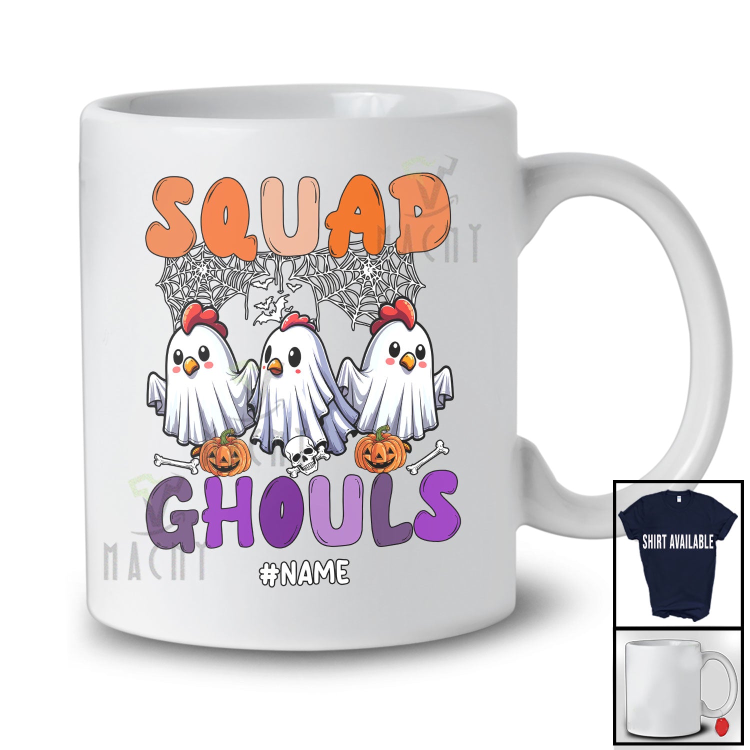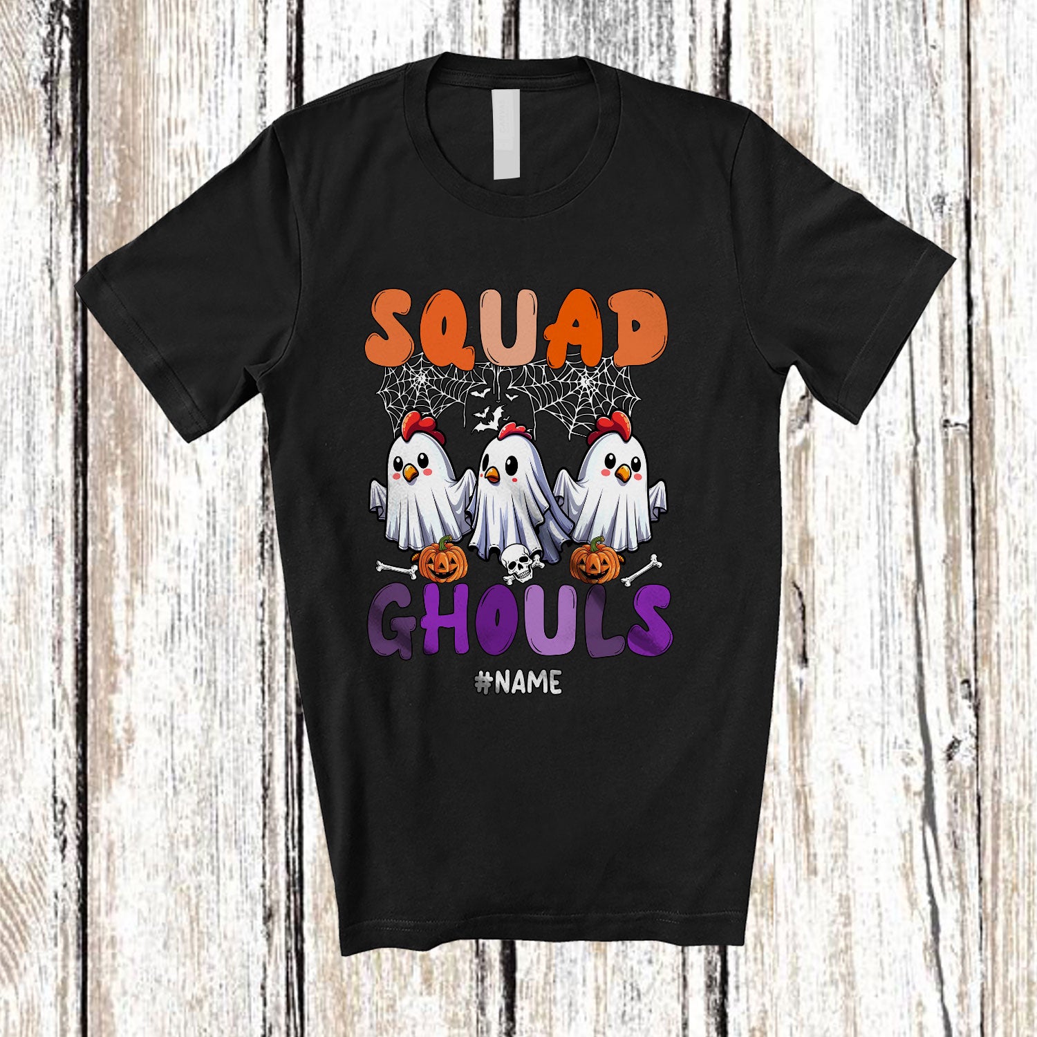 • Personalized Custom Name Squad Ghouls; Lovely Halloween Three Chicken Boo Ghost Cosplay; Farmer T-Shirt. This cotton t-shirt is a durable staple product with a classic fit. One of the most popular items, it has a relaxed style made for everyday and casual wear.