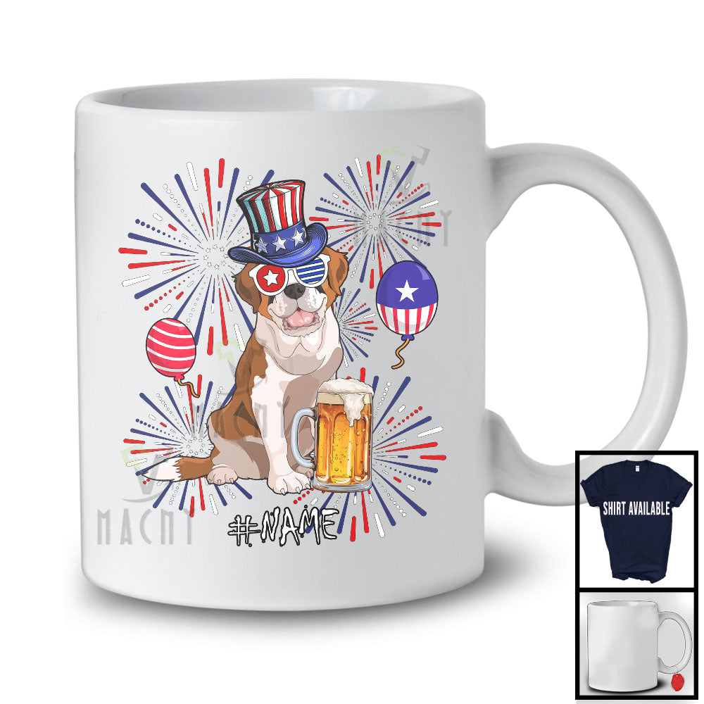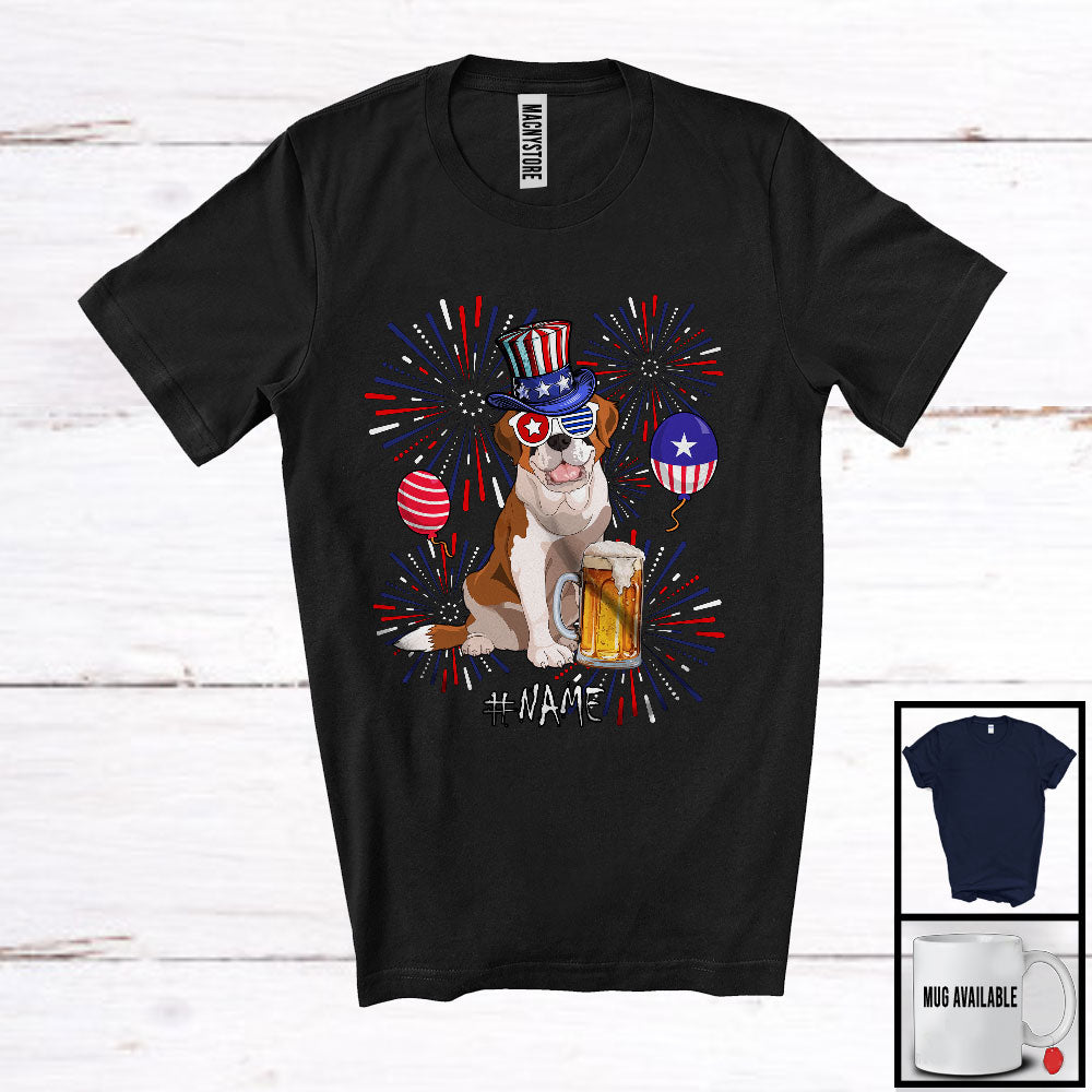 • Personalized Custom Name St. Bernard Drinking Beer, Lovely 4th Of July Fireworks, Patriotic T-Shirt. This cotton t-shirt is a durable staple product with a classic fit. One of the most popular items, it has a relaxed style made for everyday and casual wear.