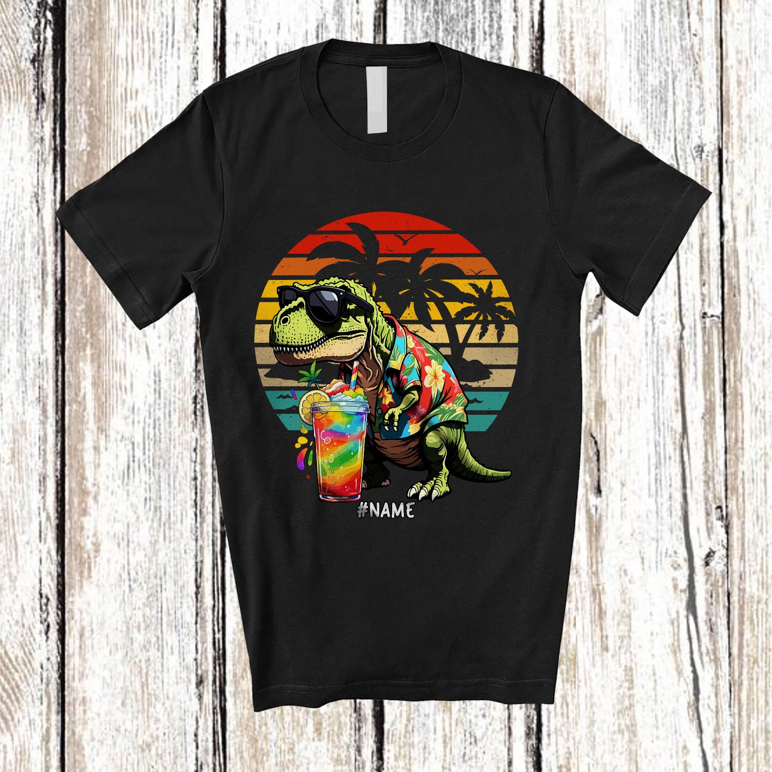 Personalized Custom Name T-Rex Drinking Cocktail; Joyful Summer Vacation T-Rex Hawaiian T-Shirt. This cotton t-shirt is a durable staple product with a classic fit. One of the most popular items, it has a relaxed style made for everyday and casual wear.