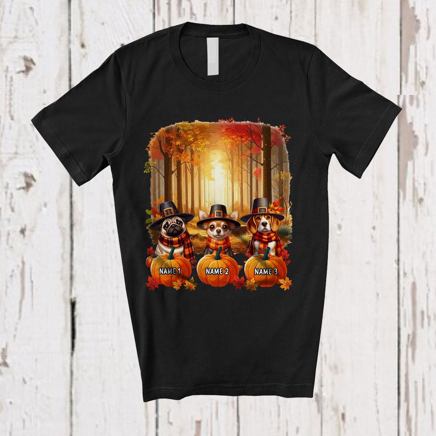 Personalized Custom Name Three Pilgrim Dog Fall Landscape; Lovely Thanksgiving Fall Pumpkin Dog Owner T-Shirt