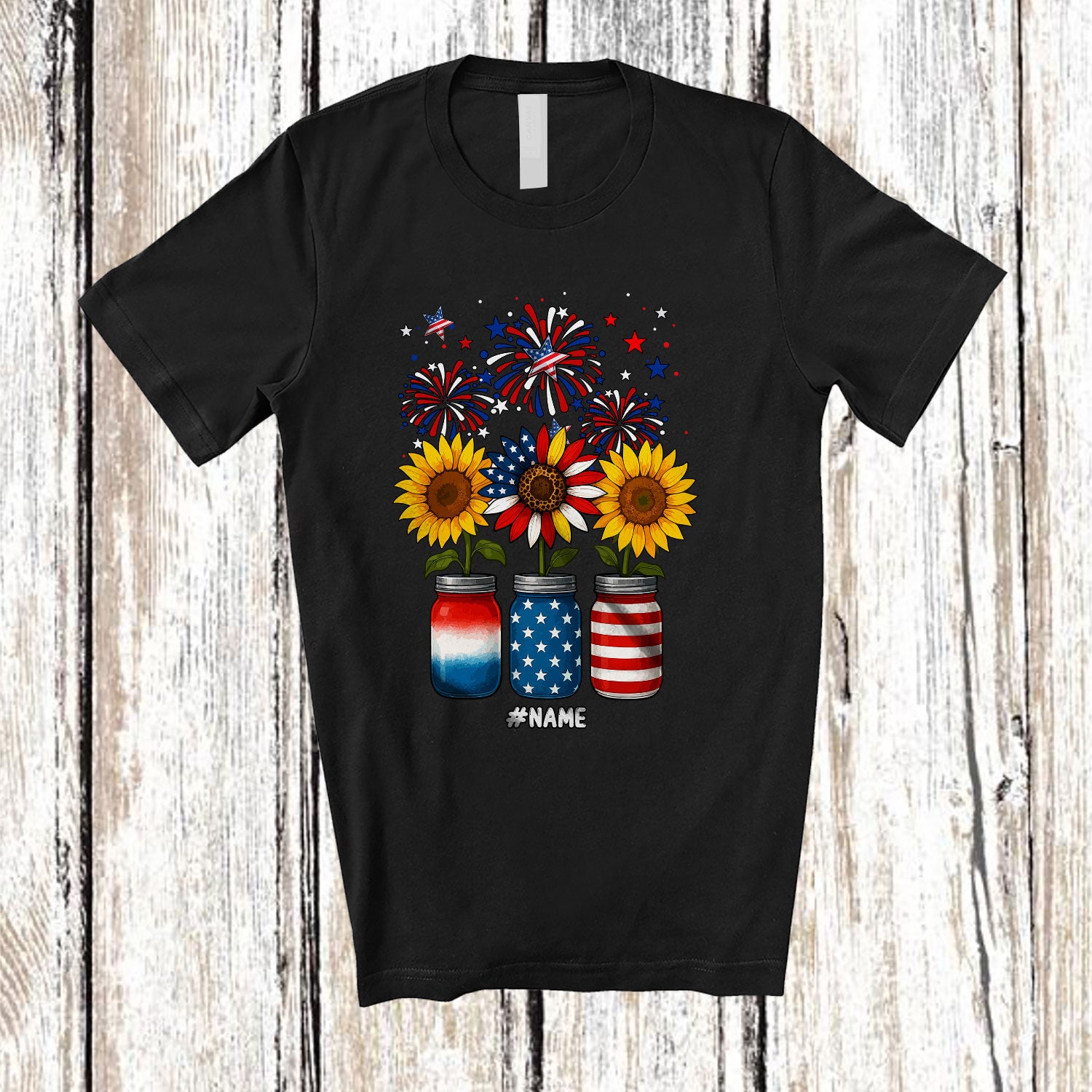 Personalized Custom Name Three Sunflowers In Bottle; Lovely 4th of July Gardener Farmer Patriotic T-Shirt