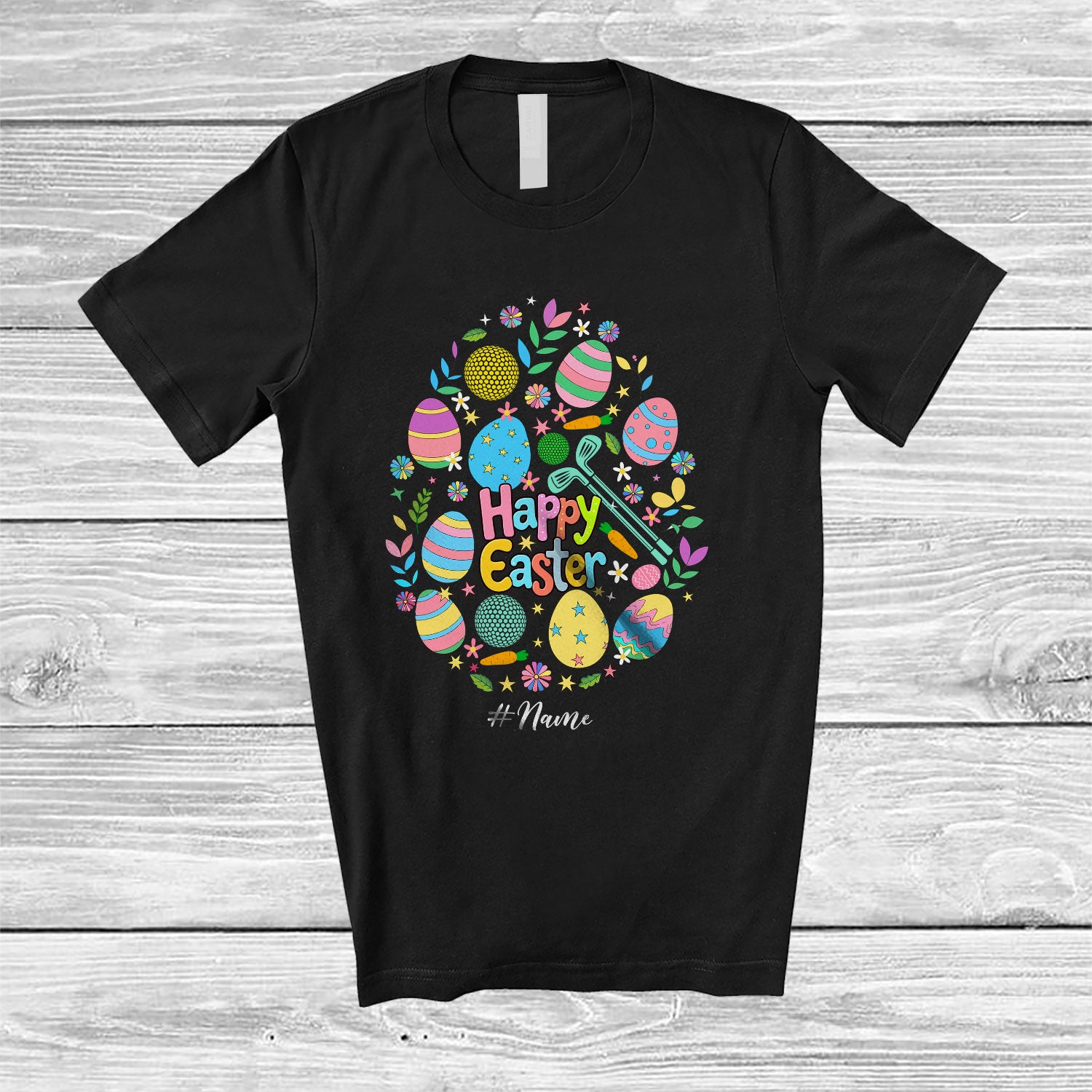 • Personalized Happy Easter; Lovely Custom Name Golf Easter Egg Shape; Sport Player T-Shirt. This cotton t-shirt is a durable staple product with a classic fit. One of the most popular items, it has a relaxed style made for everyday and casual wear.