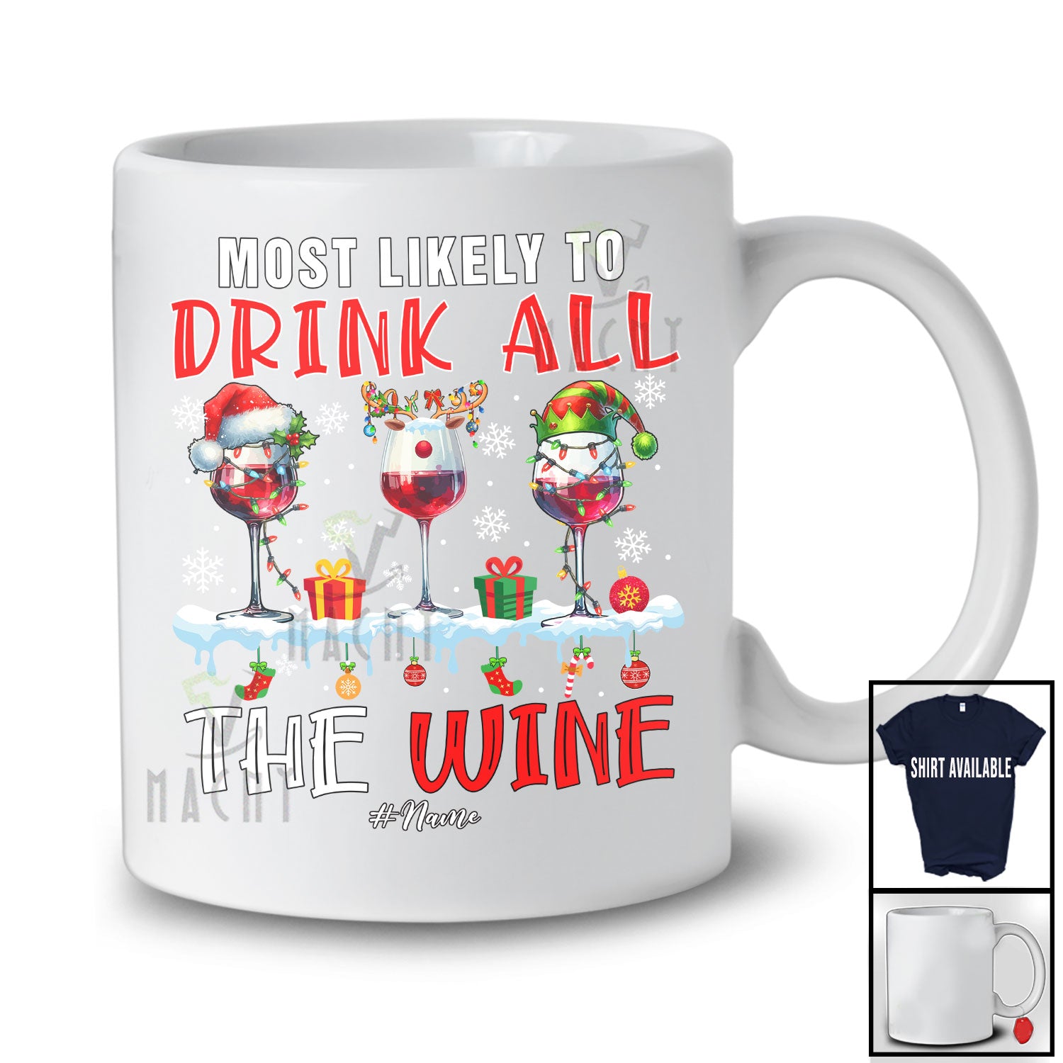 Personalized Most Likely To Drink All The Wine; Joyful Christmas Custom Name Naughty Drinking T-Shirt. This cotton t-shirt is a durable staple product with a classic fit. One of the most popular items, it has a relaxed style made for everyday and casual wear.