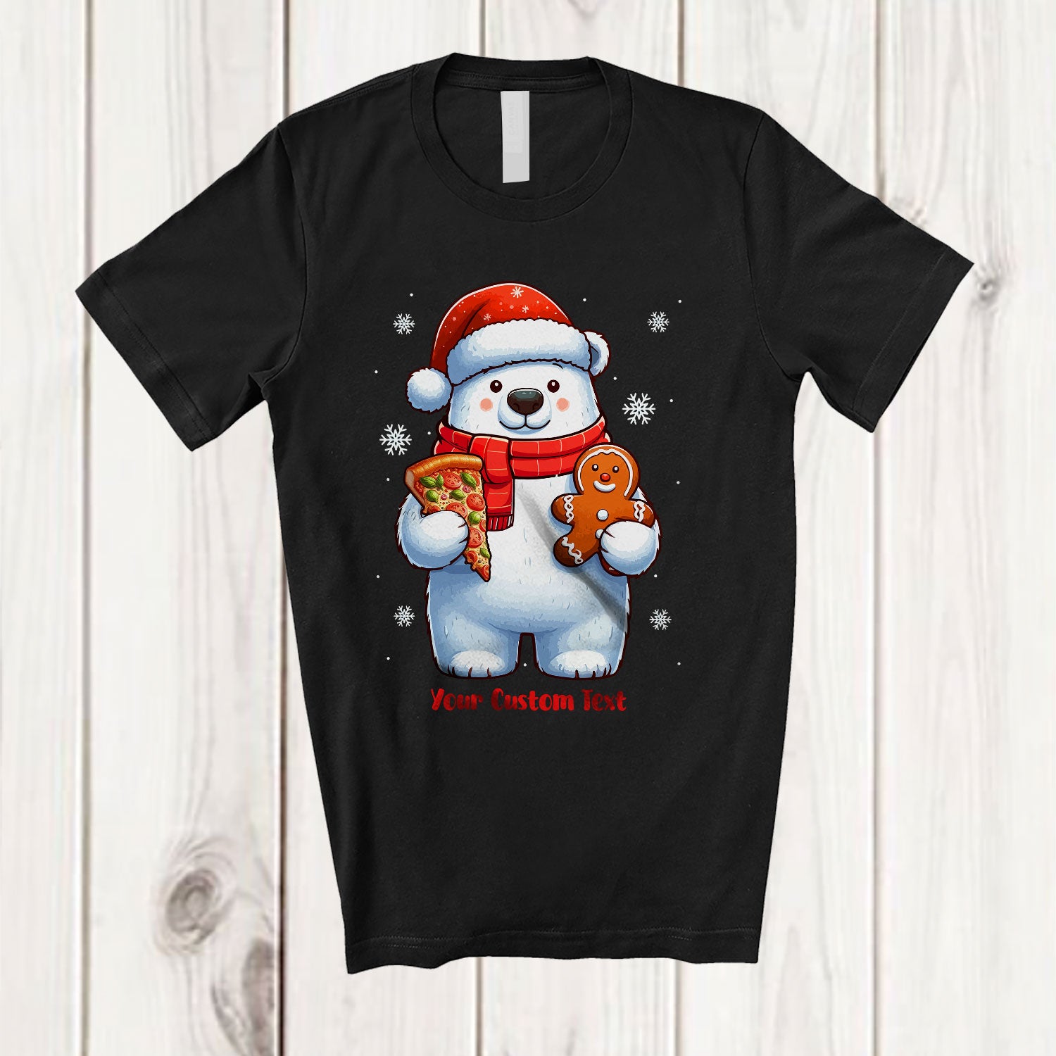 • Personalized Santa Polar Bear Eating Pizza; Fantastic Christmas Custom Name Gingerbread; Baking T-Shirt. This cotton t-shirt is a durable staple product with a classic fit. One of the most popular items, it has a relaxed style made for everyday and casual wear.