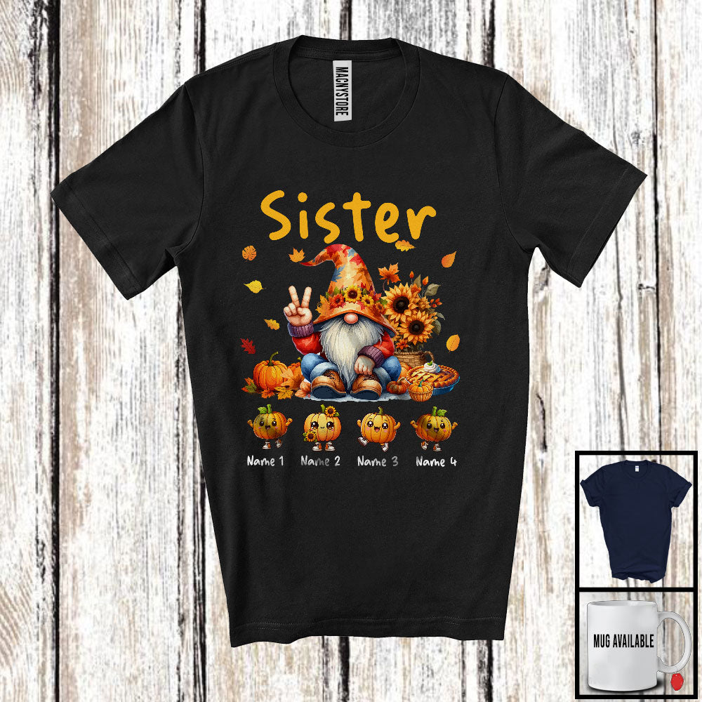 • Personalized Sister; Lovely Thanksgiving Custom Name Gnome; Pumpkins Sunflowers Family T-Shirt. This cotton t-shirt is a durable staple product with a classic fit. One of the most popular items, it has a relaxed style made for everyday and casual wear.