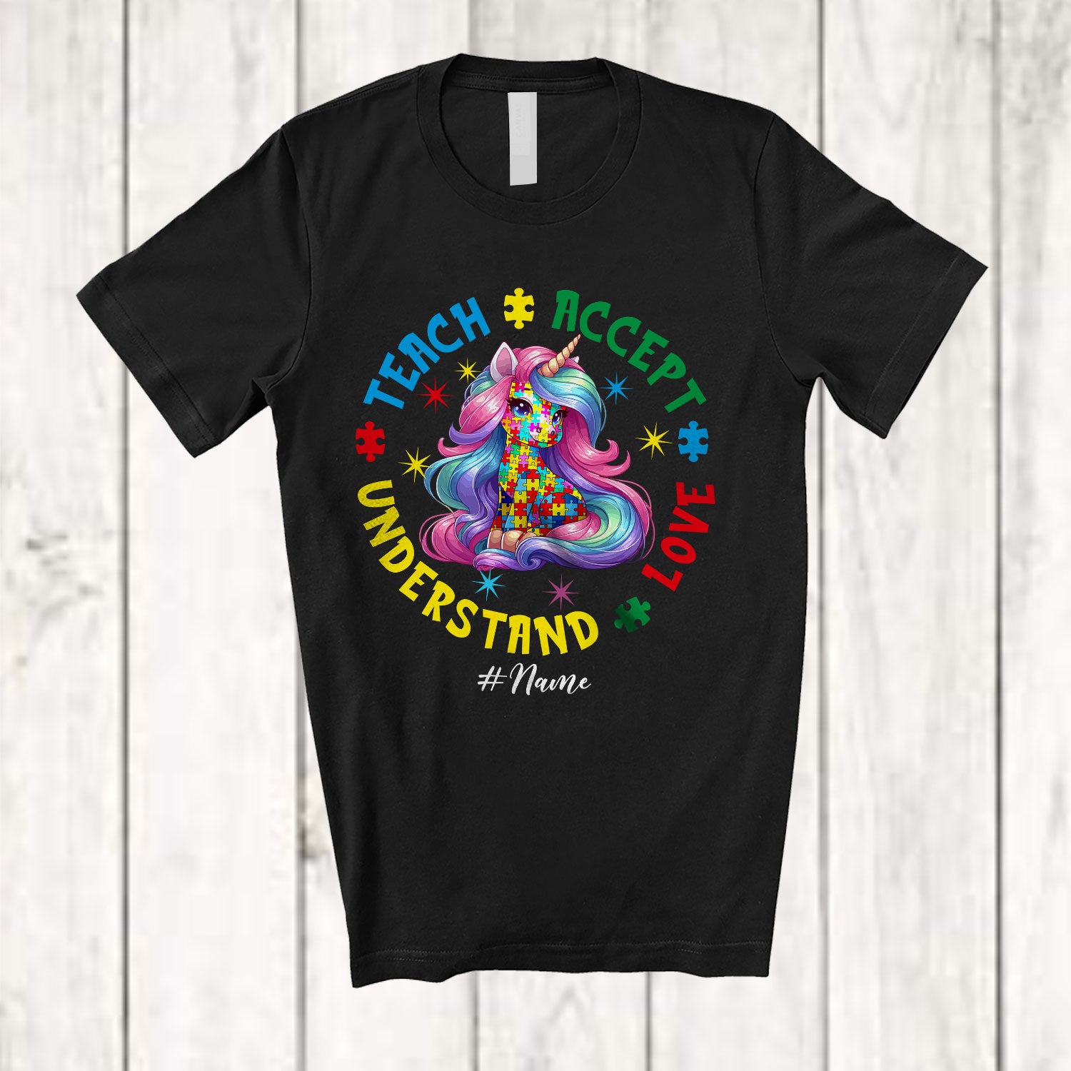 Personalized Teach Accept Understand Love; Amazing Autism Puzzle Unicorn; Custom Name Teacher T-Shirt. This cotton t-shirt is a durable staple product with a classic fit. One of the most popular items, it has a relaxed style made for everyday and casual wear.