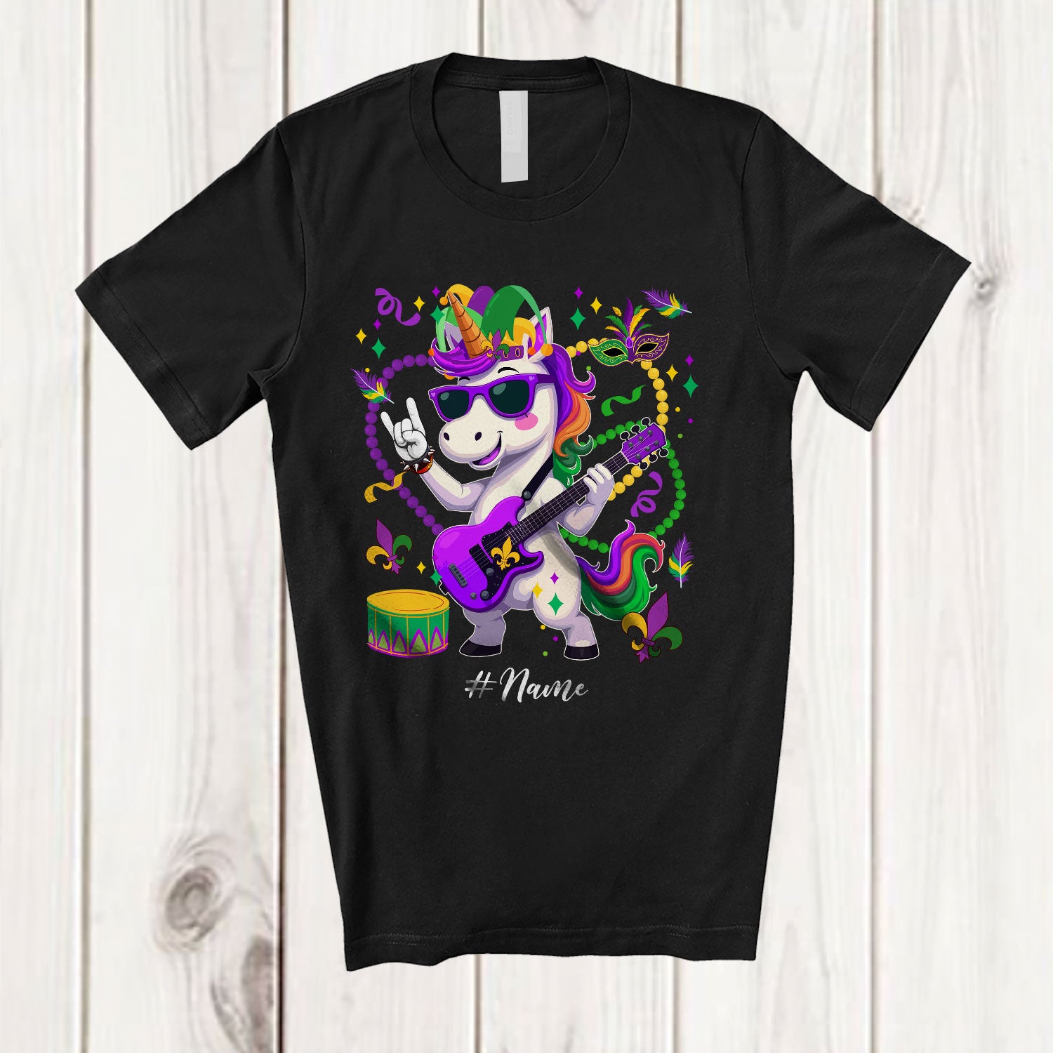 Personalized Unicorn Rock; Lovely Mardi Gras Unicorn Bass Player; Custom Name Guitarist T-Shirt