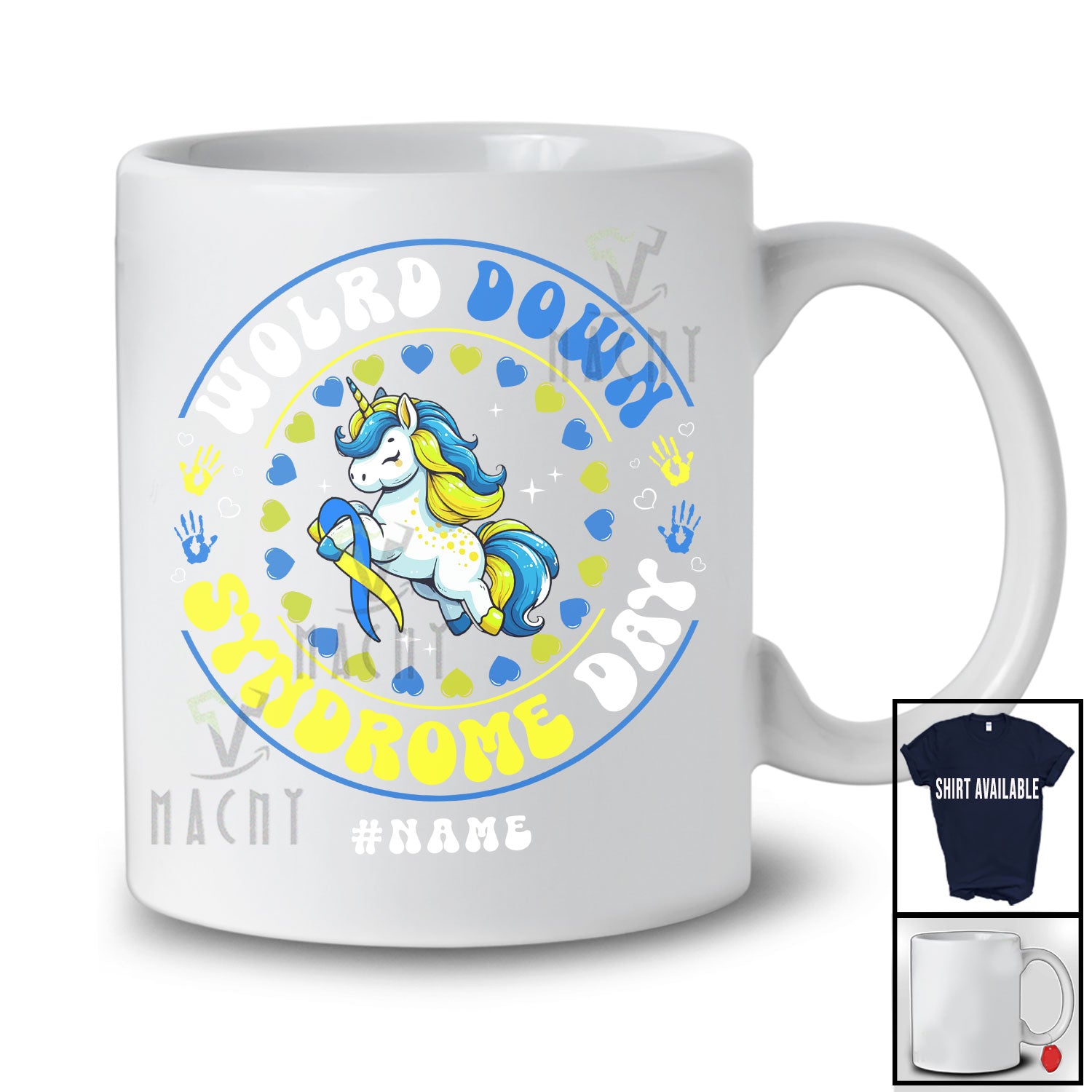 new MacnyStore - Personalized World Down Syndrome Day; Lovely Custom Name Unicorn Hearts; Blue Yellow Ribbon T-Shirt – Macnystore