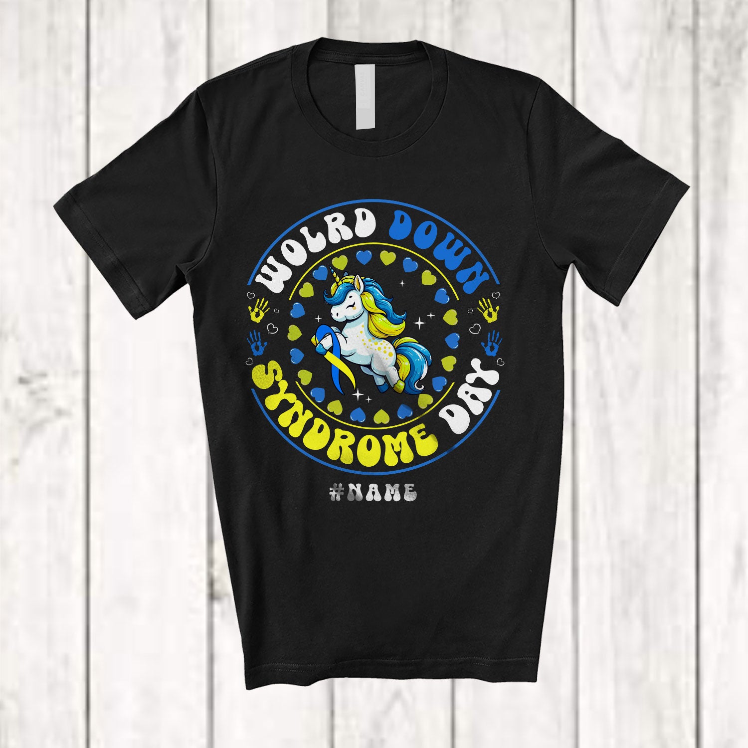 • Personalized World Down Syndrome Day; Lovely Custom Name Unicorn Hearts; Blue Yellow Ribbon T-Shirt. This cotton t-shirt is a durable staple product with a classic fit. One of the most popular items, it has a relaxed style made for everyday and casual wear.