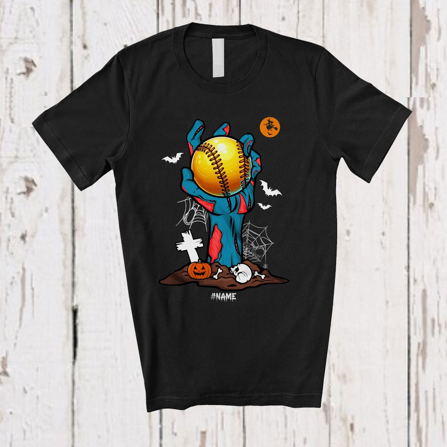 new MacnyStore - Personalized Zombie Hand Holding Softball Ball; Horror Halloween Custom Name Player Sport Team T-Shirt – Macnystore