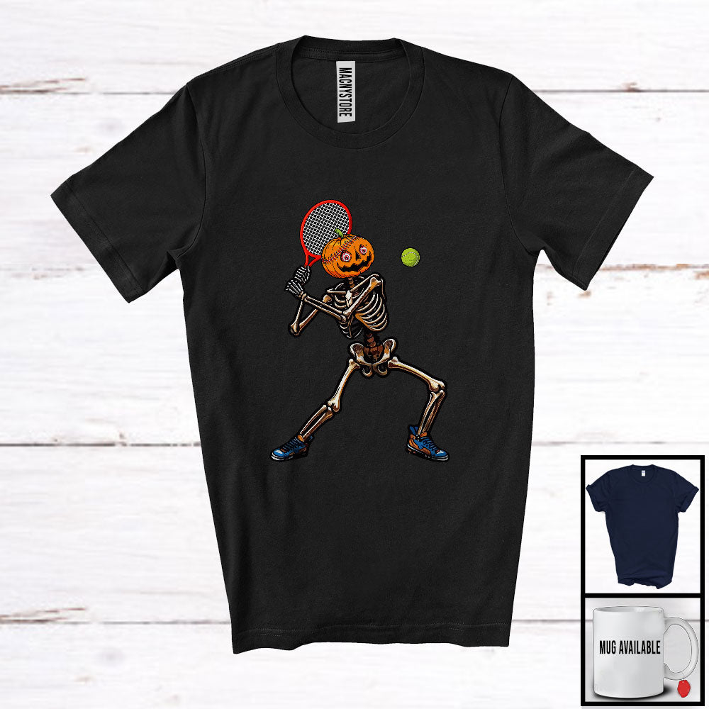 Pumpkin Skeleton Playing Tennis; Creepy Halloween Costume Sport Player Team; Family Group T-Shirt