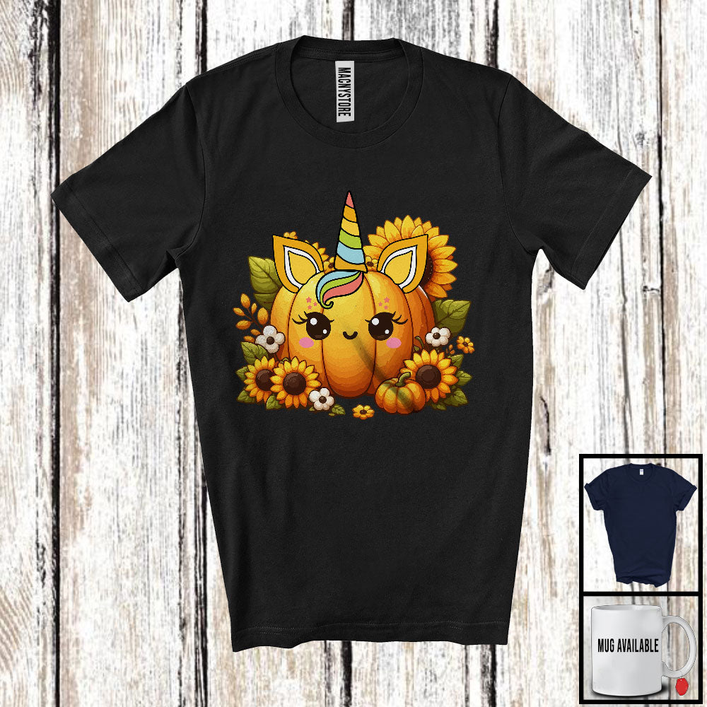 Pumpkin Unicorn Face; Lovely Thanksgiving Unicorn Face With Pumpkins Sunflowers; Family T-Shirt