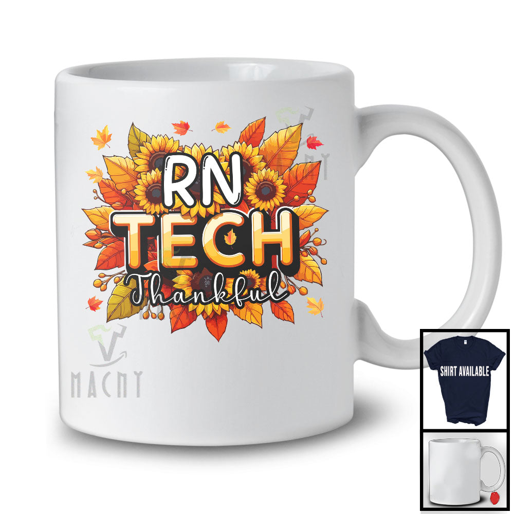 RN Tech Thankful; Wonderful Thanksgiving Sunflowers Fall Leaves; Family Nurse Group T-Shirt. This cotton t-shirt is a durable staple product with a classic fit. One of the most popular items, it has a relaxed style made for everyday and casual wear.