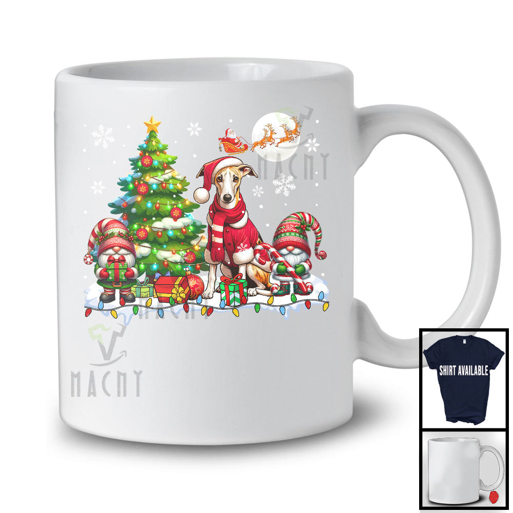 Santa Whippet With Gnome X-mas Tree, Merry Christmas Lights, Snowing Family Group T-Shirt