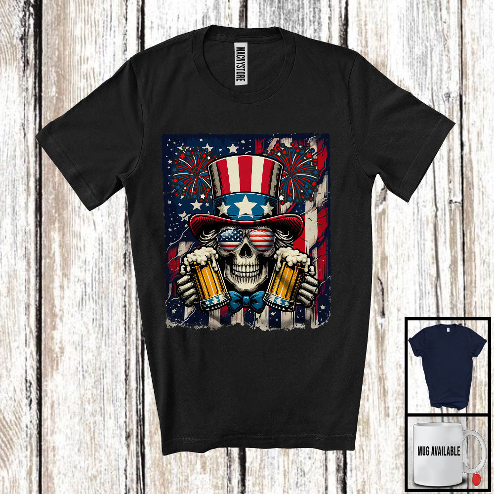 Skull Drinking Beer, Cheerful 4th Of July American Flag Drunker Team, Fireworks Patriotic T-Shirt