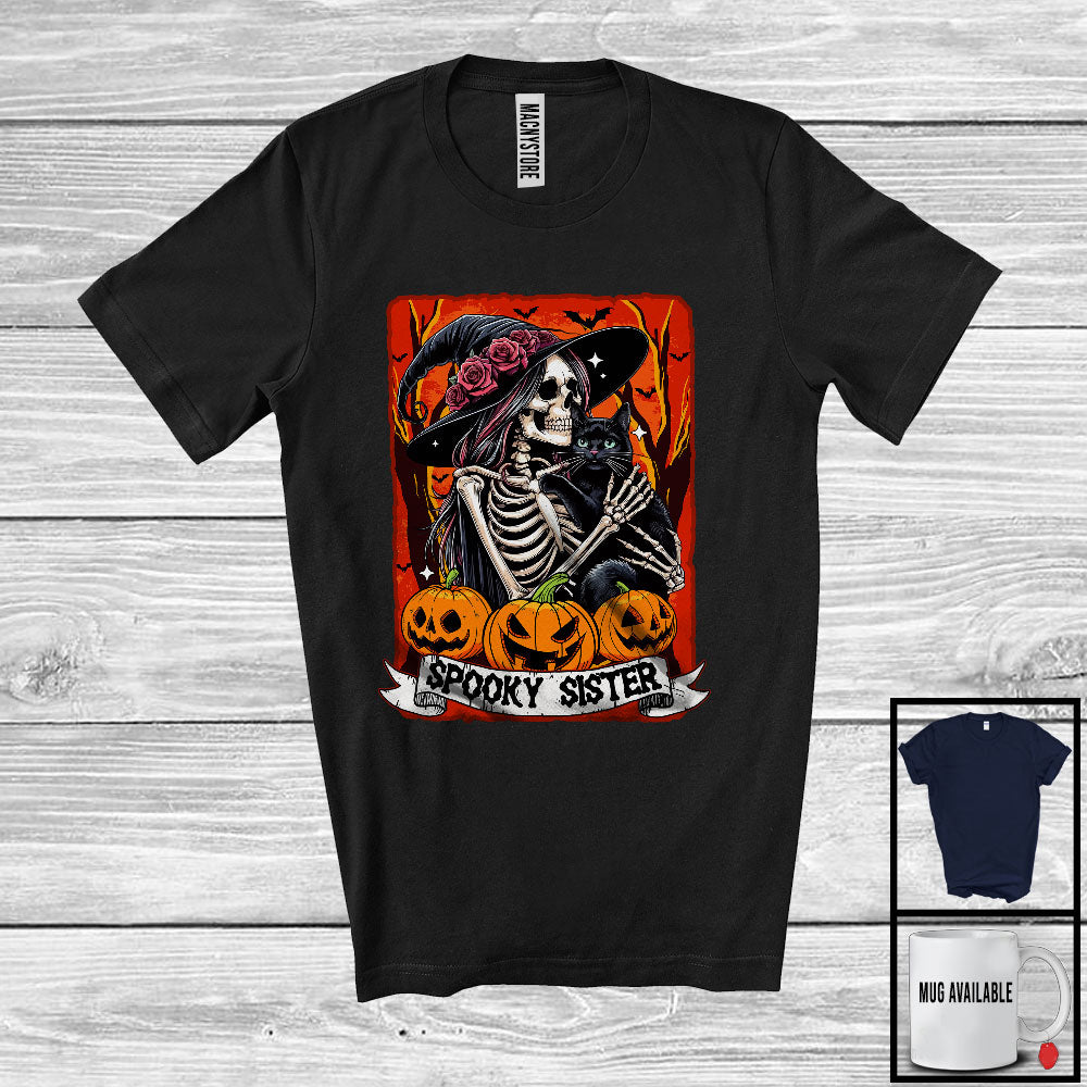 Spooky Sister; Horror Halloween Costume Tarot Card Witch Black Cat; Matching Family Group T-Shirt. This cotton t-shirt is a durable staple product with a classic fit. One of the most popular items, it has a relaxed style made for everyday and casual wear.