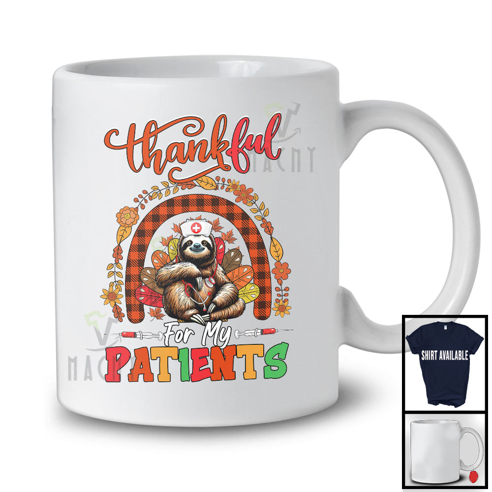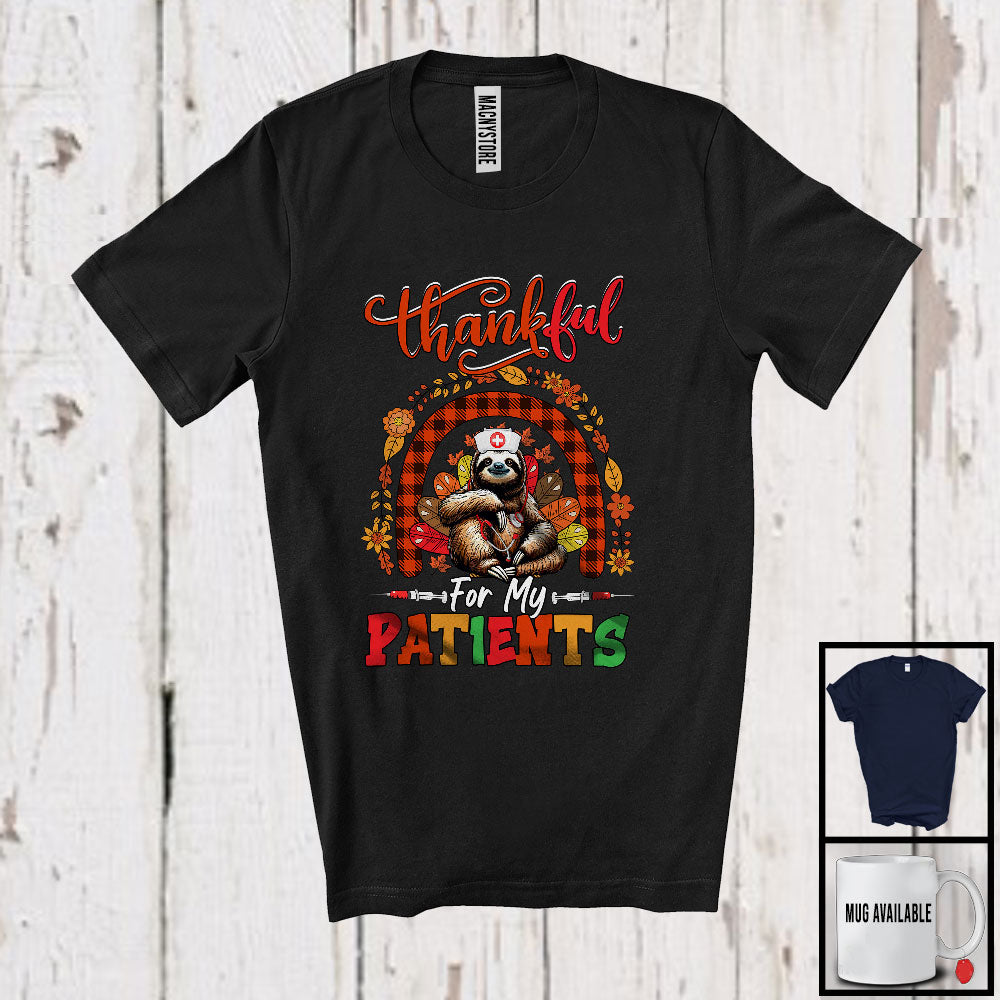 Thankful For My Patients; Wonderful Thanksgiving Sloth Turkey Plaid Rainbow; Nurse Team Nursing T-Shirt. This cotton t-shirt is a durable staple product with a classic fit. One of the most popular items, it has a relaxed style made for everyday and casual wear.