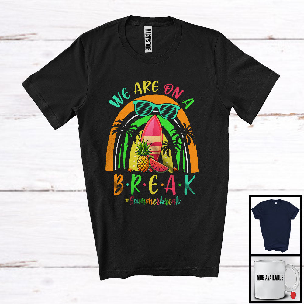 We Are On A Break, Adorable Summer Vacation Beach Trip Travel Lover, Sunglasses Rainbow T-Shirt. This cotton t-shirt is a durable staple product with a classic fit. One of the most popular items, it has a relaxed style made for everyday and casual wear.