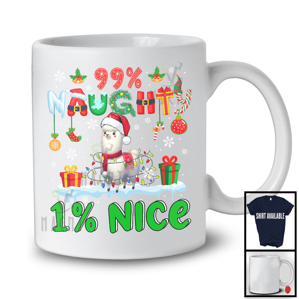 • 99% Naughty 1% Nice; Awesome Christmas Lights Santa Llama Lover; Family Snowing Around T-Shirt. This cotton t-shirt is a durable staple product with a classic fit. One of the most popular items, it has a relaxed style made for everyday and casual wear.
