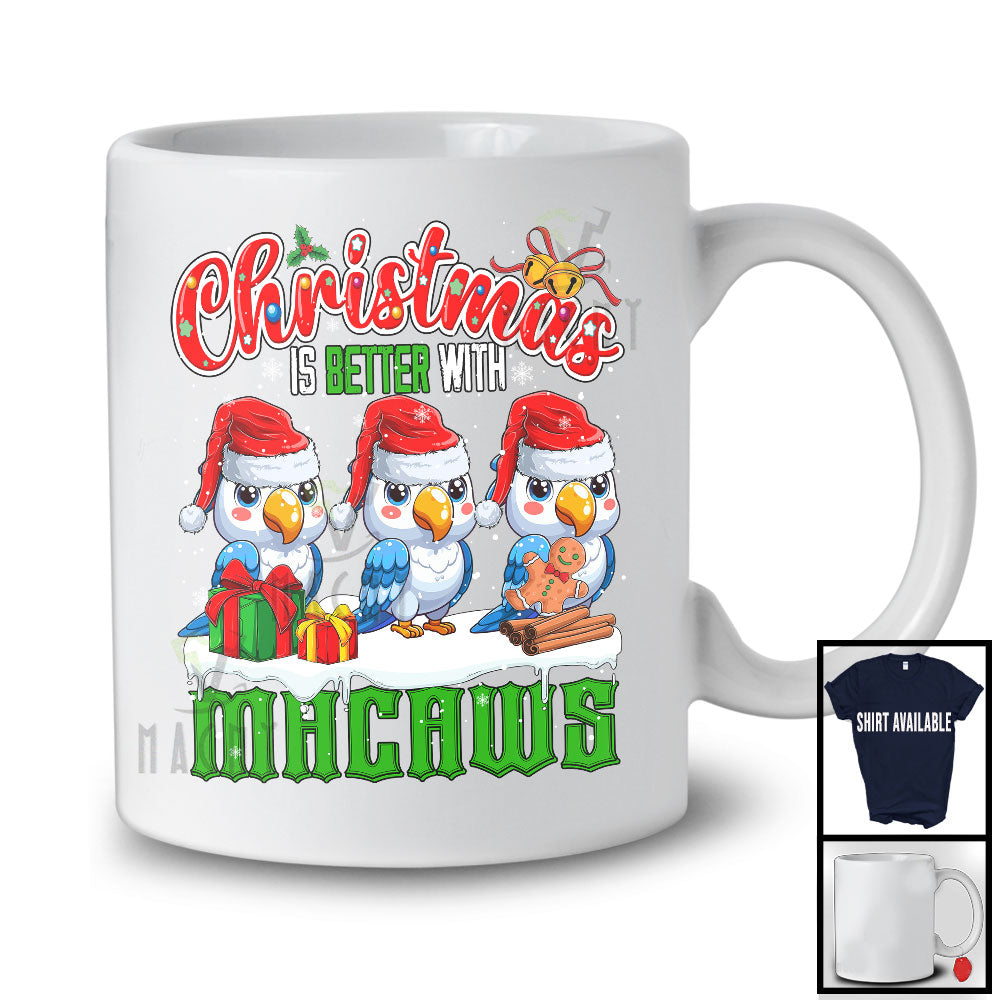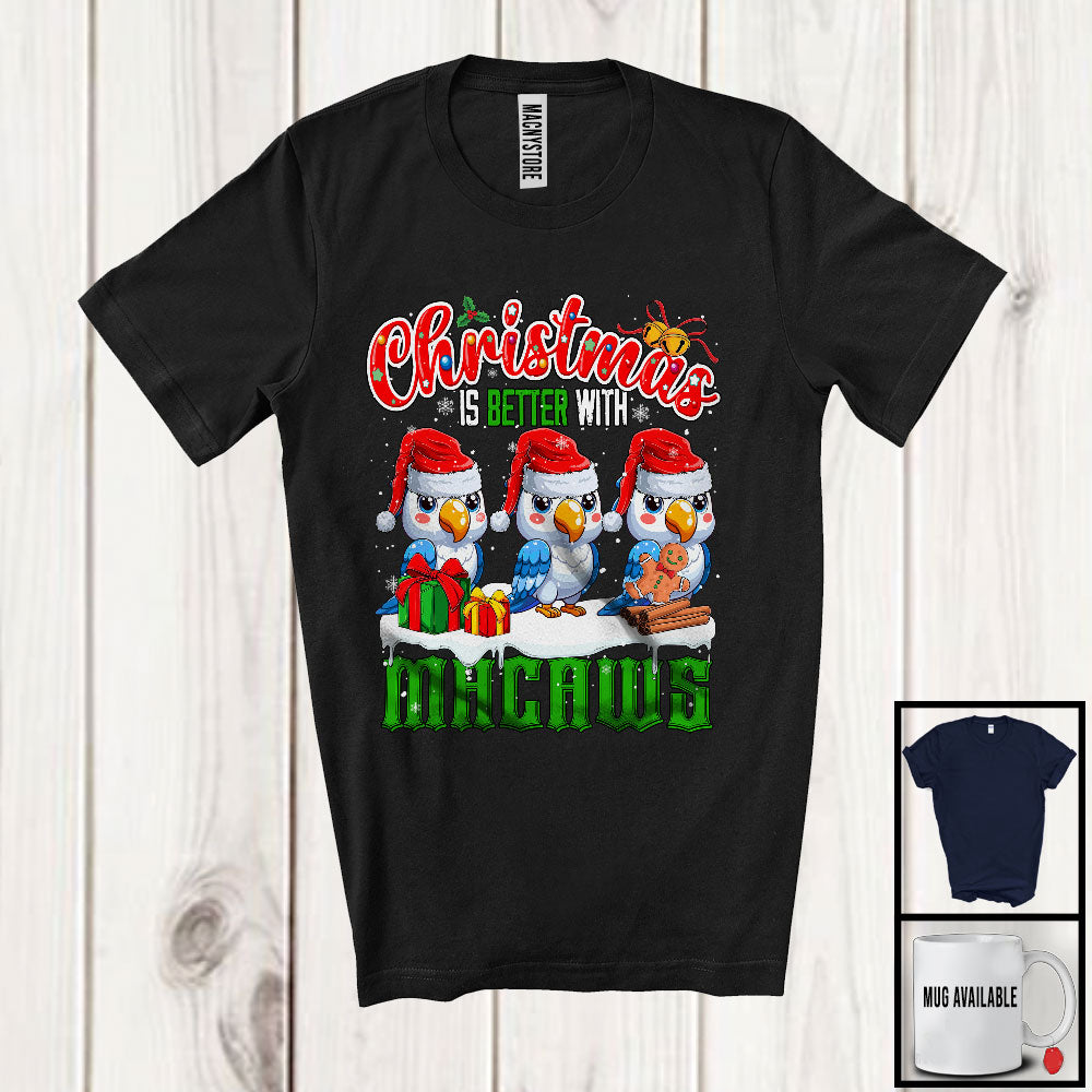 • Christmas Is Better With Macaws; Adorable X-mas Three Santa Macaws Animal; Family Group T-Shirt. This cotton t-shirt is a durable staple product with a classic fit. One of the most popular items, it has a relaxed style made for everyday and casual wear.