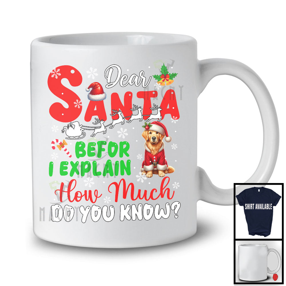 • Dear Santa Before I Explain; Wonderful Christmas Golden Retriever Santa Naughty; Snowing T-Shirt. This cotton t-shirt is a durable staple product with a classic fit. One of the most popular items, it has a relaxed style made for everyday and casual wear.
