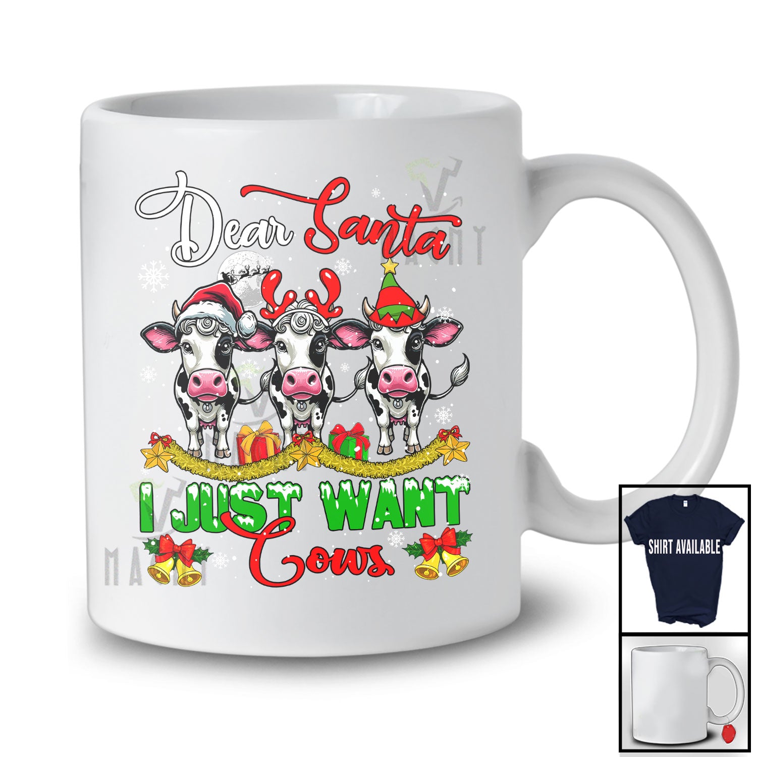 The Dear Santa I Just Want Cows; Humorous Christmas Three Santa Reindeer Elf Cows; Snowing Farmer T-Shirt destined to impress, and priced at only $12.95, for a limited time.