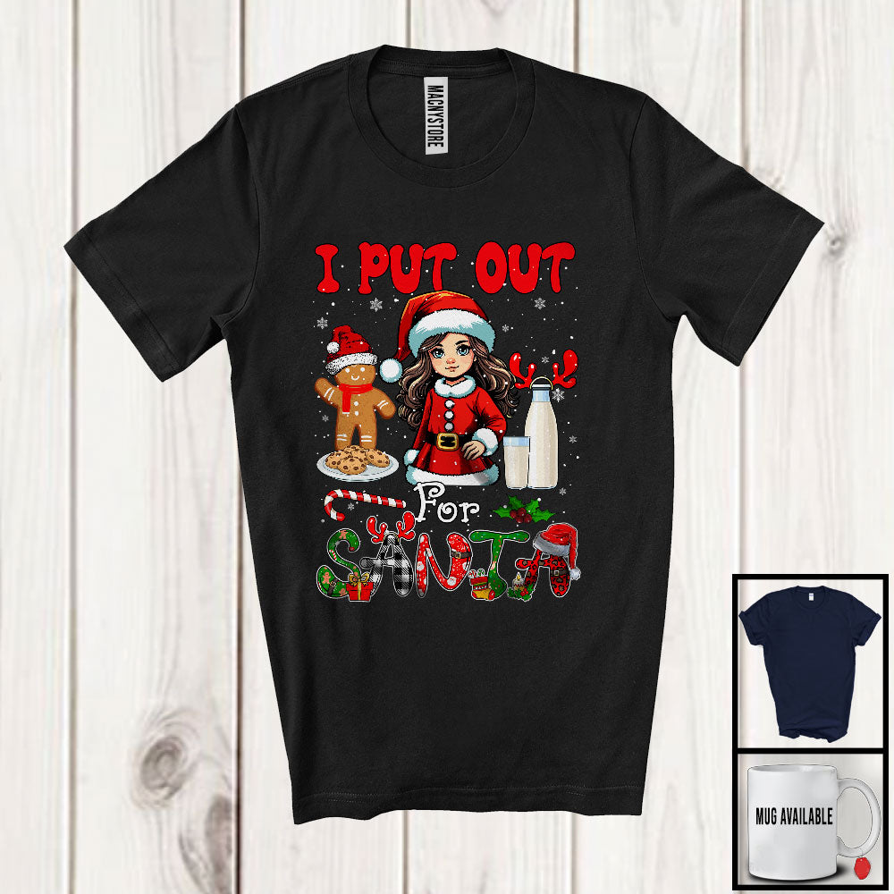 I Put Out For Santa; Cheerful Christmas Cookie Milk Plaid Girl X-mas Santa; Family T-Shirt. This cotton t-shirt is a durable staple product with a classic fit. One of the most popular items, it has a relaxed style made for everyday and casual wear.