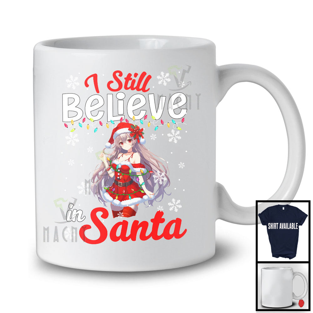 • I Still Believe In Santa; Humorous Christmas Lights Santa Anime Girl; Japanese Family Group T-Shirt. This cotton t-shirt is a durable staple product with a classic fit. One of the most popular items, it has a relaxed style made for everyday and casual wear.