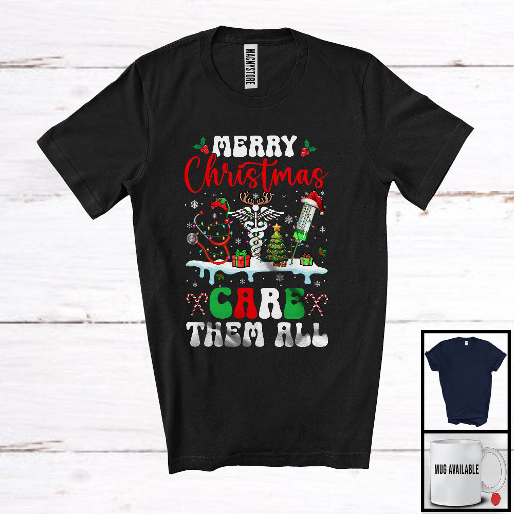 Merry Christmas Care Them All; Adorable Christmas Three Nurse Tools; Snowing Family Group T-Shirt