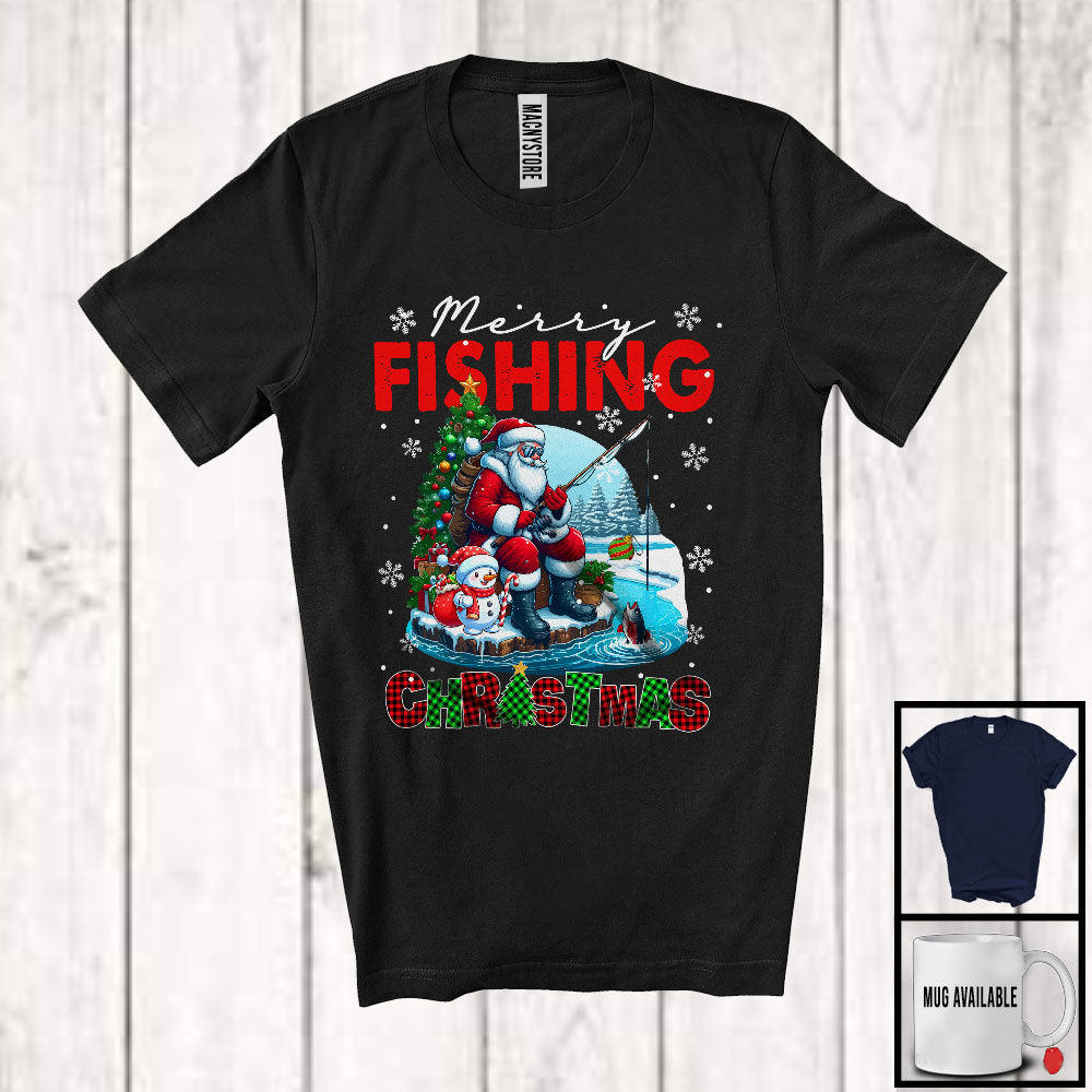 new MacnyStore - Merry Fishing; Joyful Christmas Lights Santa Fishing Lover; X-mas Snowing Around T-Shirt – Macnystore