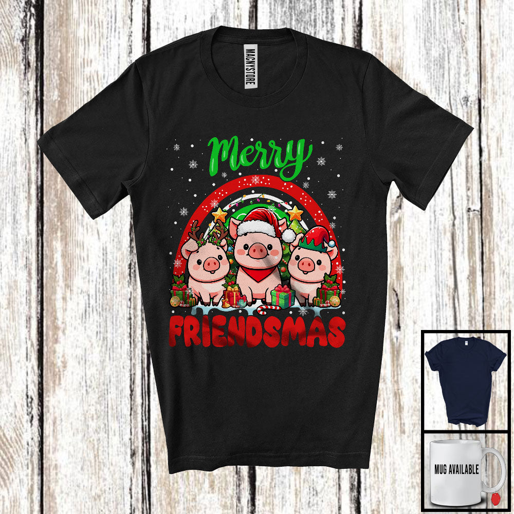 • Merry Friendmas, Amazing Christmas Three Pig Santa ELF Reindeer, Rainbow Snowing T-Shirt. This cotton t-shirt is a durable staple product with a classic fit. One of the most popular items, it has a relaxed style made for everyday and casual wear.