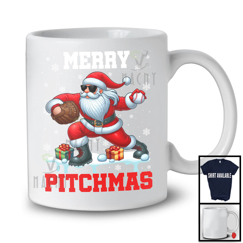 Merry Pitchmas; Awesome Christmas Snowing Santa Playing Baseball; Pitcher Sport Team T-Shirt. This cotton t-shirt is a durable staple product with a classic fit. One of the most popular items, it has a relaxed style made for everyday and casual wear.