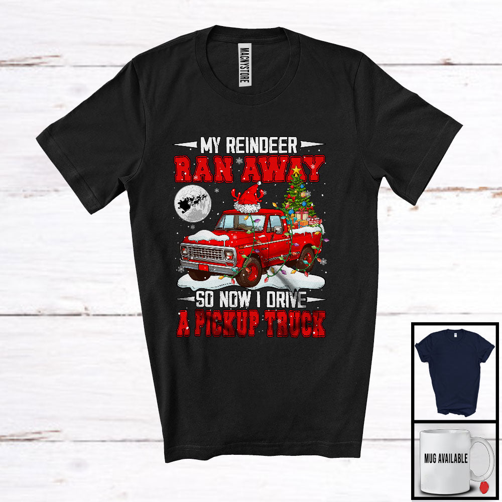 The My Reindeer Ran Away Now I Drive A Pickup Truck; Humorous Christmas Santa Driver; Family T-Shirt destined to impress, and priced at only $12.95, for a limited time.