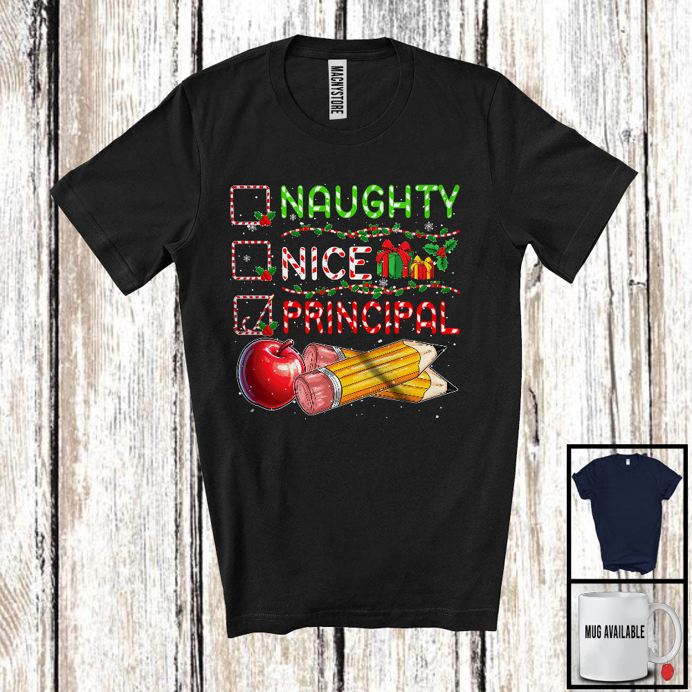 • Naughty Nice Principal; Cheerful Christmas Snowing Around Santa; Principal Family Group T-Shirt. This cotton t-shirt is a durable staple product with a classic fit. One of the most popular items, it has a relaxed style made for everyday and casual wear.