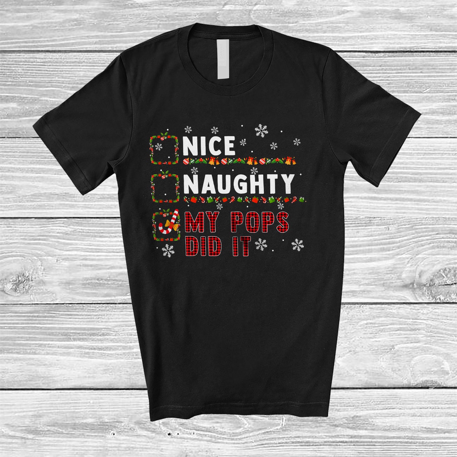 • Nice Naughty My Pops Did It; Wonderful Christmas Red Plaid Santa Snowing; Family Group T-Shirt. This cotton t-shirt is a durable staple product with a classic fit. One of the most popular items, it has a relaxed style made for everyday and casual wear.