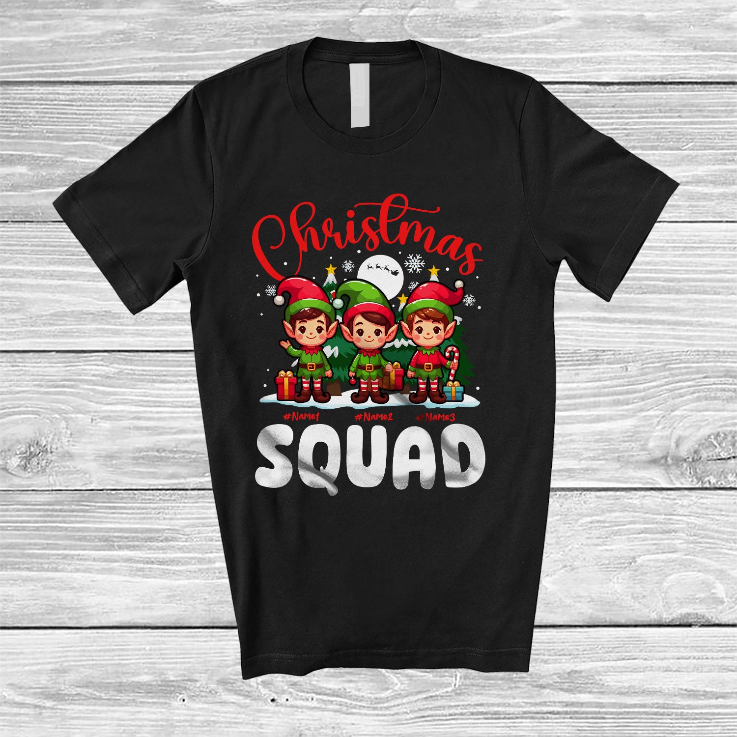 Personalized Christmas Squad; Awesome X-mas Custom Name Three Elf; Snowing Family T-Shirt. This cotton t-shirt is a durable staple product with a classic fit. One of the most popular items, it has a relaxed style made for everyday and casual wear.