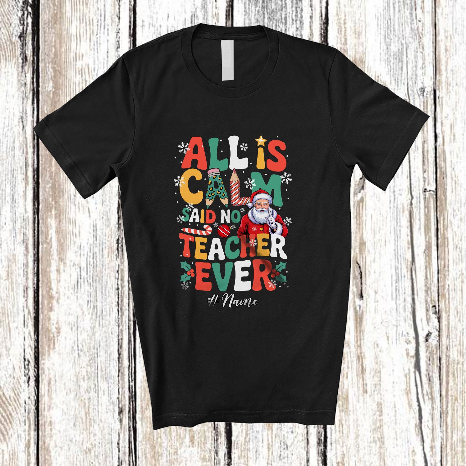 • Personalized Custom Name All Is Calm Said No Teacher Ever; Awesome Christmas Santa Family T-Shirt. This cotton t-shirt is a durable staple product with a classic fit. One of the most popular items, it has a relaxed style made for everyday and casual wear.