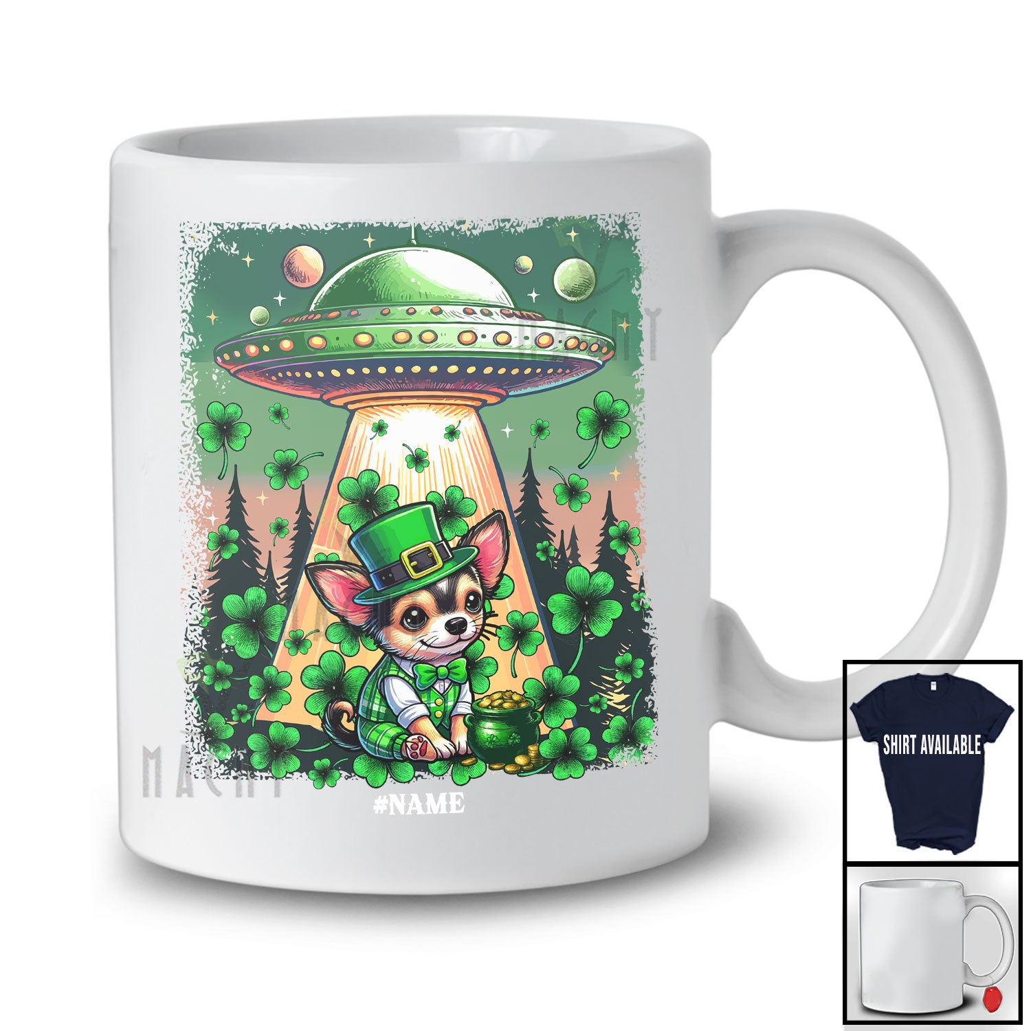 Personalized Custom Name Chihuahua Leprechaun UFO; Joyful St. Patrick's Day Stolen Shamrock T-Shirt. This cotton t-shirt is a durable staple product with a classic fit. One of the most popular items, it has a relaxed style made for everyday and casual wear.